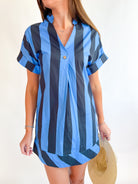 Effortless elegance meets playful style with the Allyson Striped V-Neck Dress. This versatile piece features classic stripes and a flattering V-neckline that works beautifully for everything from casual outings to weekend brunches. The relaxed fit ensures all-day comfort while the timeless pattern keeps you looking fresh and put-together. Perfect for layering with your favorite jacket or wearing solo, this dress is about to become your go-to favorite.