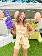 This mid-weight vest showcases a charming daisy jacquard pattern with a button-down front, V-neckline, and an adjustable belt at the back for a customized fit. Sleeveless and trendy, it’s ideal to wear with matching shorts for a bright, coordinated outfit.