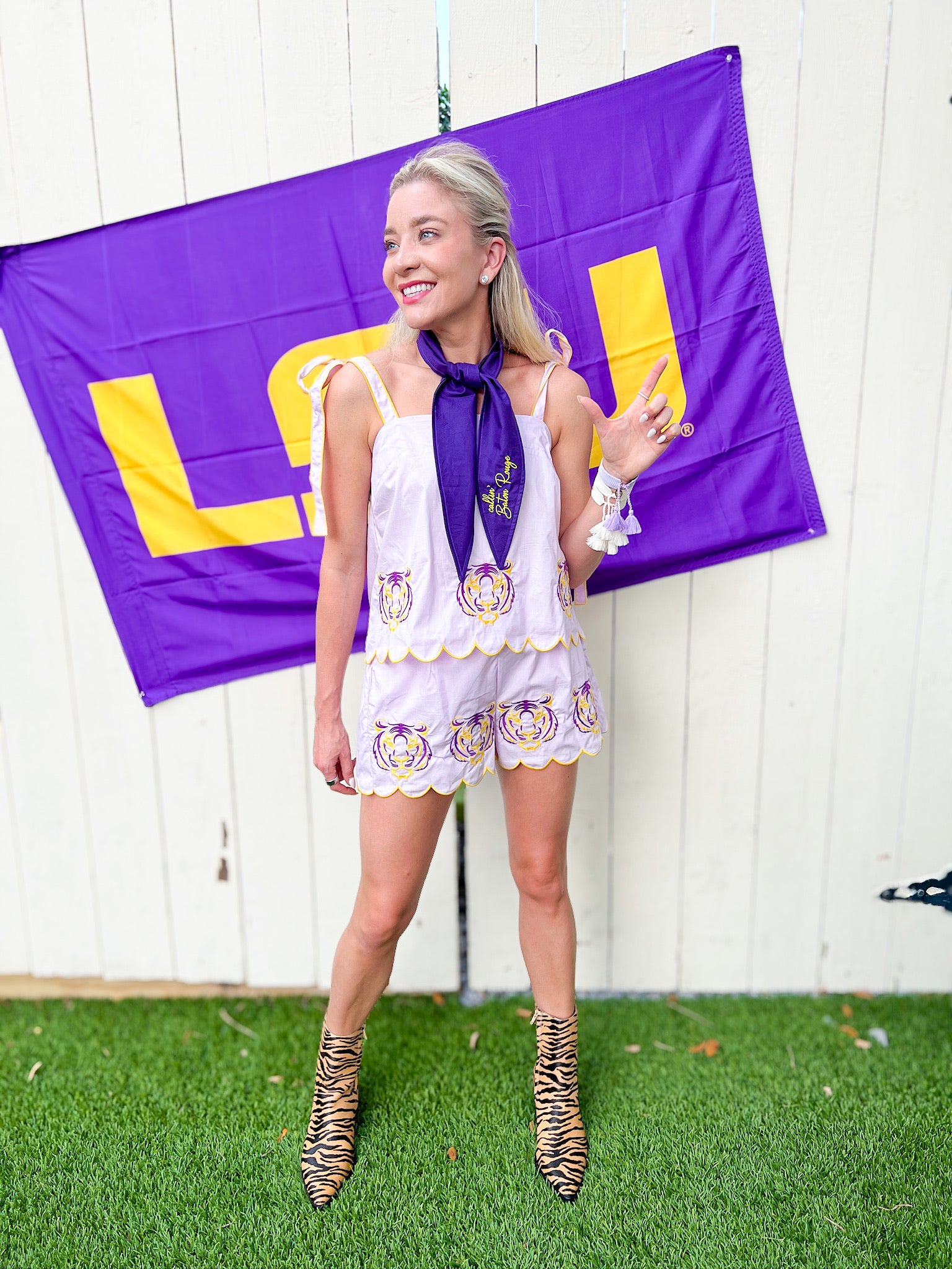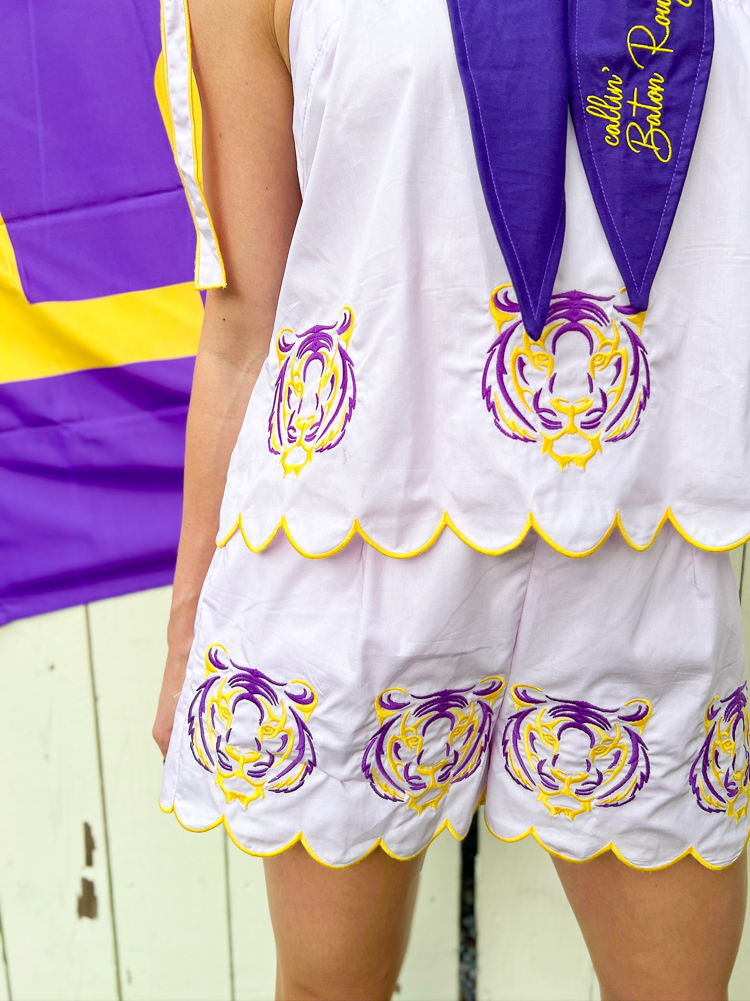 Enjoy a laid-back, slightly boxy silhouette with this two-piece set featuring a sleeveless top and matching shorts. Both pieces showcase scalloped hems, contrast piping, and shoulder ties for a playful touch. Adorned with tiger embroidery on the front and hem, the shorts offer an elastic waistband for comfort. Ideal for game days, football season weekends, or a fun sporty brunch with friends.