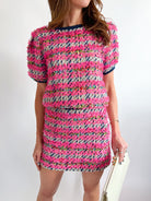 Get ready to shine with this eye-catching lurex tweed rib contrast mini skirt! The shimmering lurex threads catch the light beautifully, while the textured tweed base adds sophisticated dimension. Ribbed contrast detailing creates a modern, dynamic look that works with everything from casual tees to dressed-up tops. This mini skirt is your ticket to effortless style—perfect for making a bold statement whether you're out with friends or hitting the dance floor. Comfortable, versatile, and absolutely fabulous!