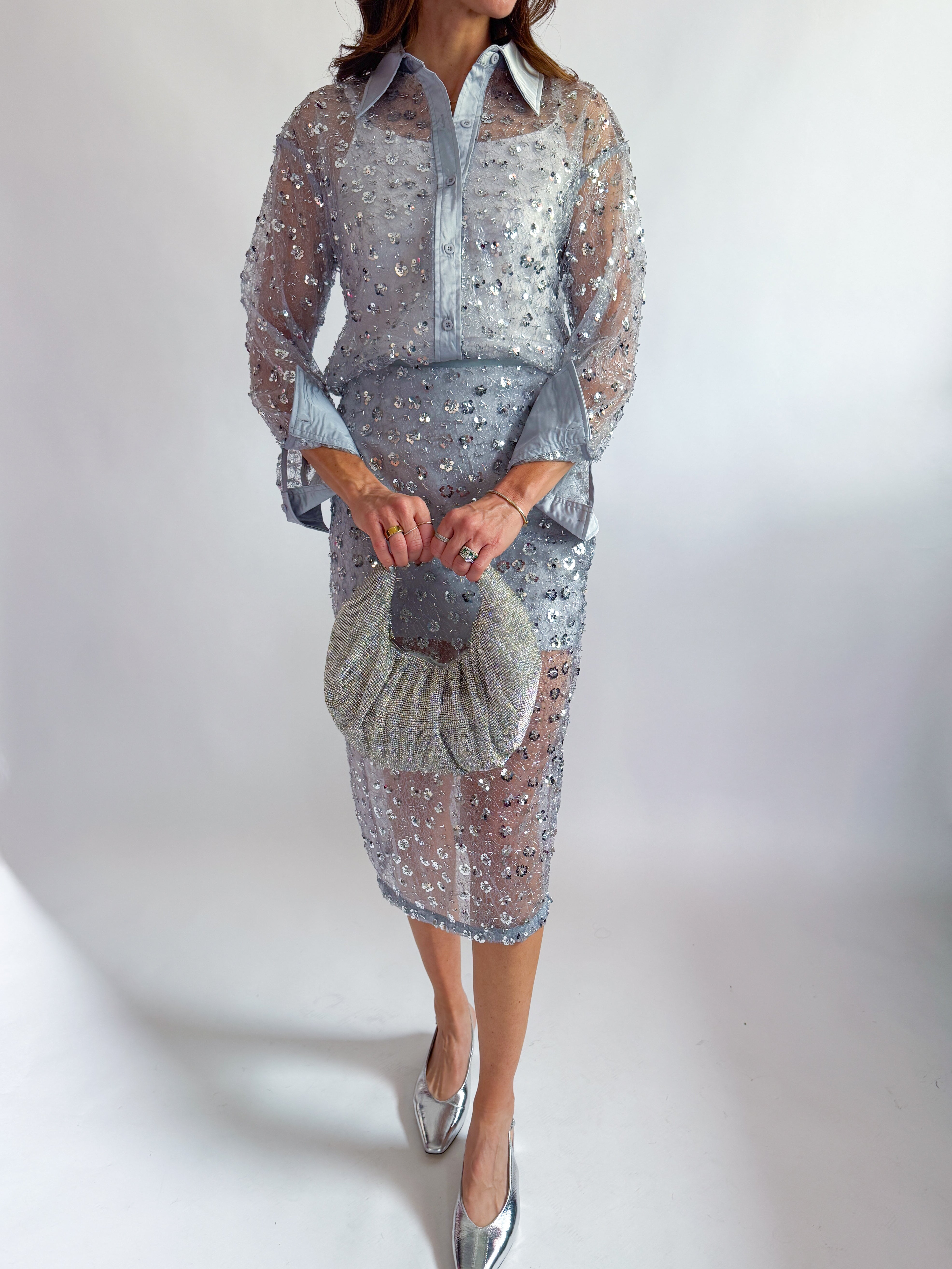 Shimmer and shine in this stunning Blue Slate Sequin Shirt! Covered in eye-catching sequins that catch the light with every move, this piece is perfect for nights out, special occasions, or whenever you want to feel absolutely fabulous. The rich blue slate color adds sophistication while the sequin detailing brings the glam. Whether you're dancing the night away or making an entrance, this shirt guarantees you'll turn heads. Dress it up with tailored pants or keep it fun with your favorite jeans—either way, you're guaranteed to sparkle!