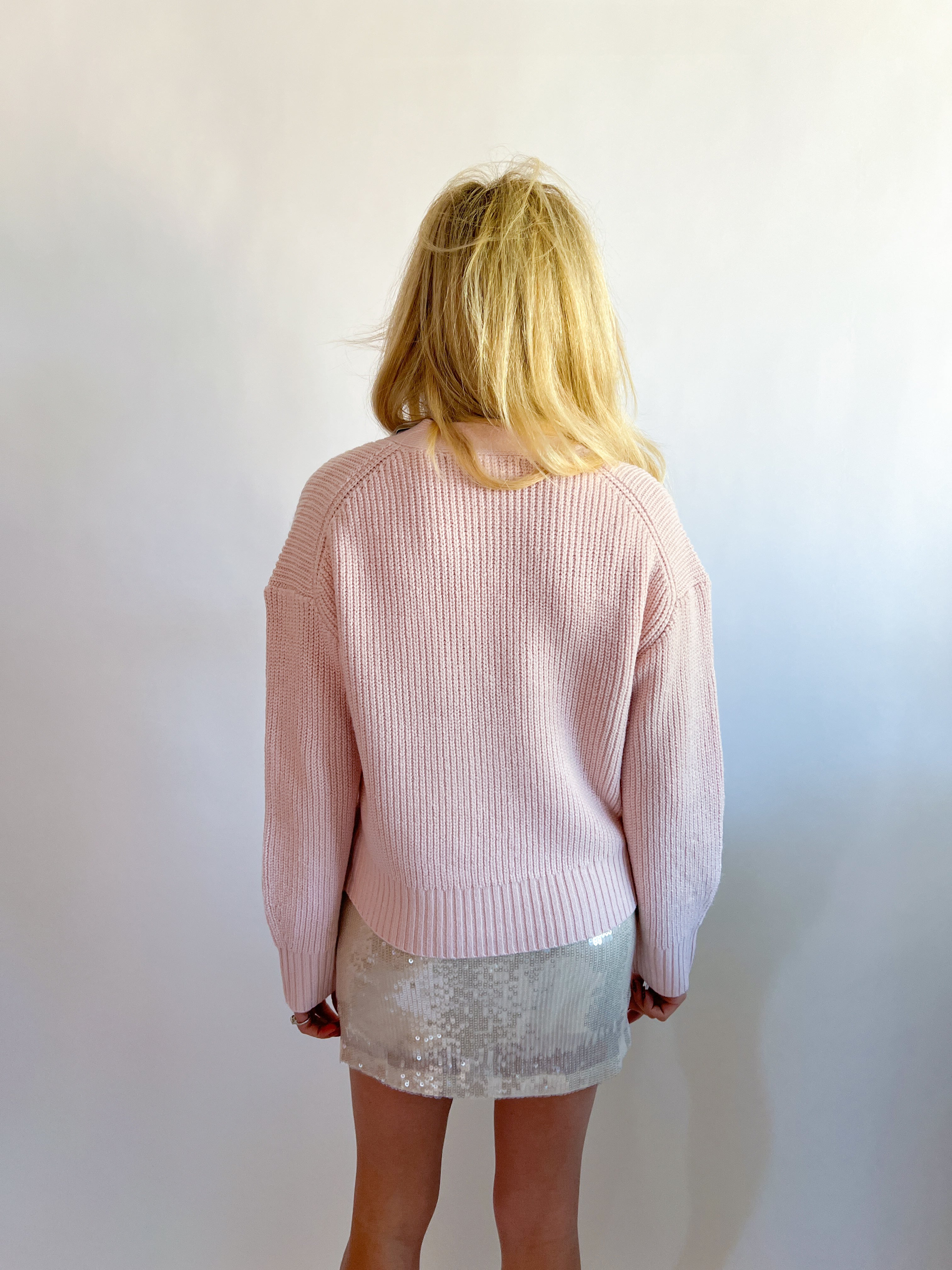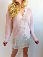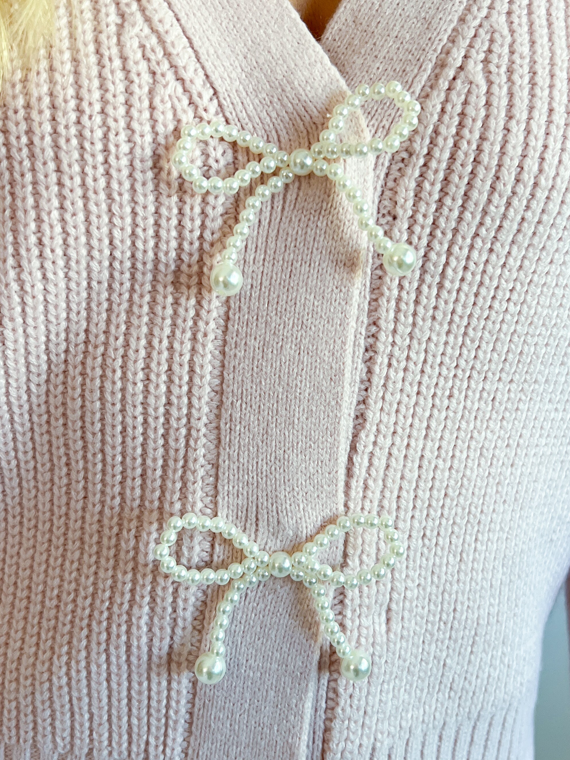 Sweet, soft, and just the right amount of statement! The Babysoft Knit Bow Top brings playful charm to your everyday wardrobe with its signature pearl-adorned bows running down the front. Crafted from a luxuriously soft, medium-weight ribbed knit, this relaxed-fit sweater features a flattering V-neckline and long sleeves perfect for layering. Dress it up over a slip dress for an effortlessly romantic look, or keep it casual with your favorite denim—either way, you've got an instant style upgrade that feels as good as it looks.