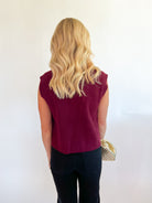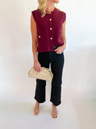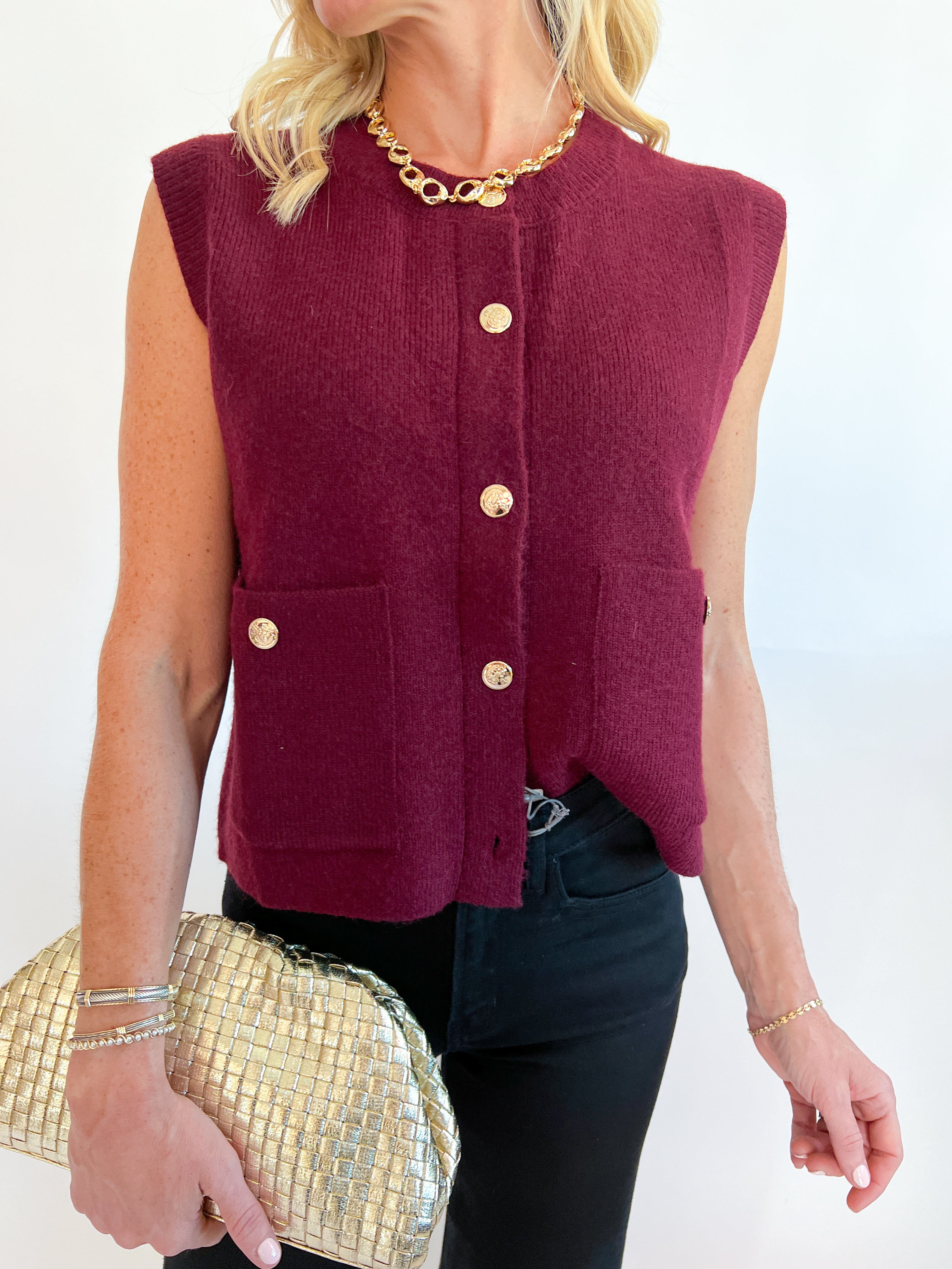 This solid wine-colored sweater knit vest features a stylish gold button closure at the front. It includes handy front pockets and is unlined for a lightweight, comfortable fit. The knit fabric is non-sheer, making it a perfect layering piece with a touch of elegance!