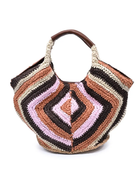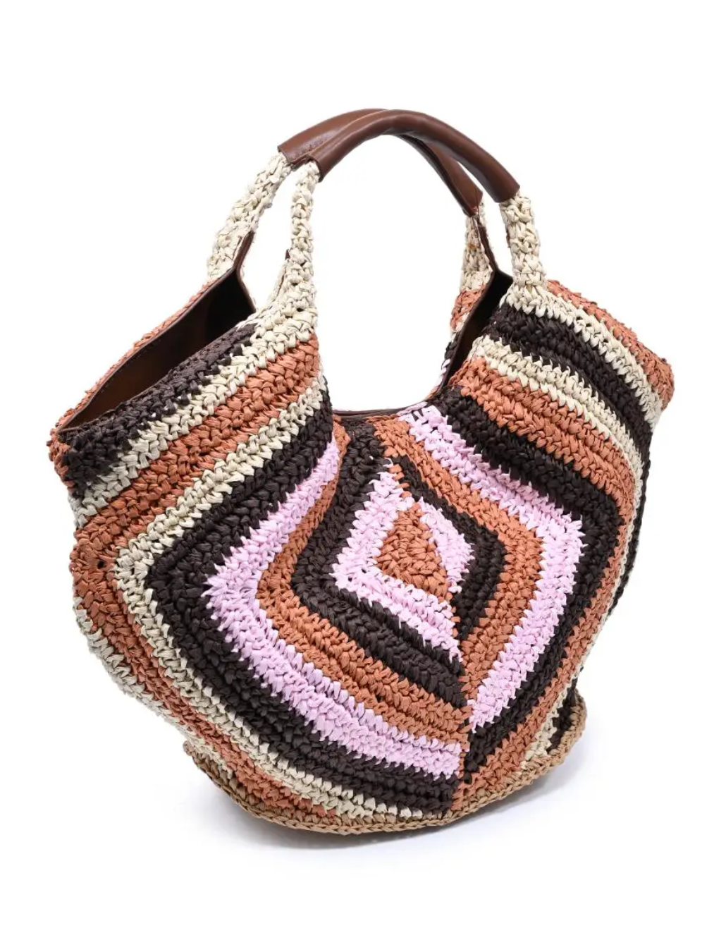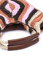 Handcrafted crescent tote with an intricate diamond-woven pattern and rich leather-wrapped handles. This artisan piece combines texture and function with its hand-crocheted striped exterior, measuring 18.13" x 6" x 9.88" and weighing 5.54 lb.
