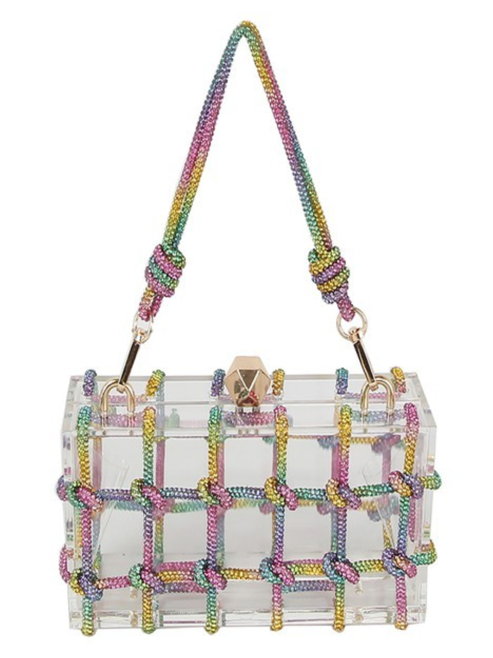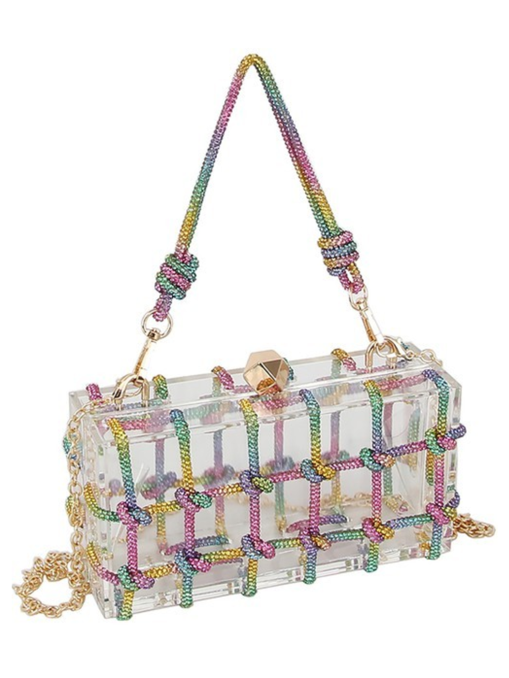 This clear acrylic evening bag features a knotted rope straw design with a boxy shape. It includes a secure push-lock closure, elegant gold-tone hardware, and a detachable chain strap for versatile wear. Perfect for adding a stylish touch to your night out!