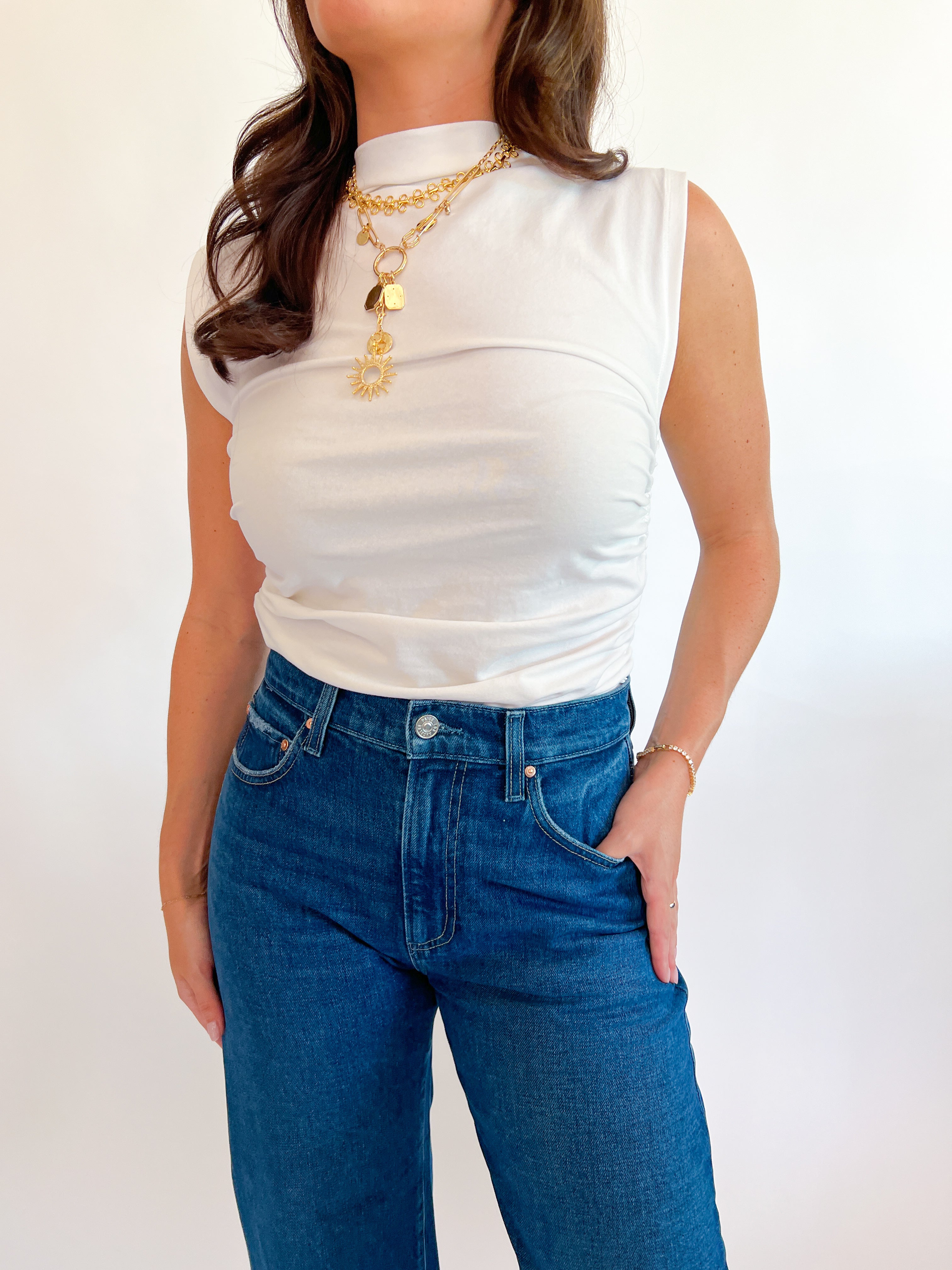 The Lavali Sleeveless Top is a chic and adaptable piece that enhances any outfit. Featuring a sleeveless cut and a mock neck, it provides a sleek silhouette and a soft, comfortable texture. The side ruching adds a sophisticated flair, making it ideal for dressing up or down with ease.