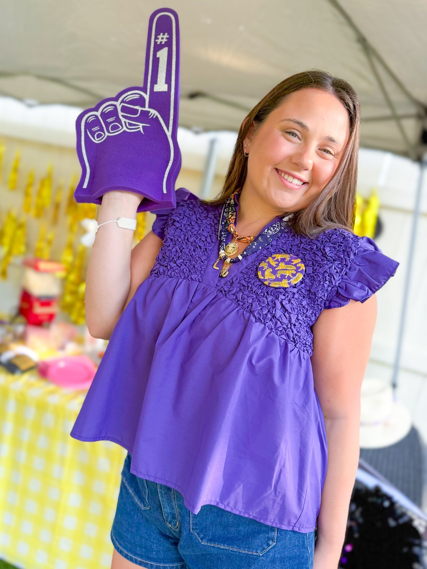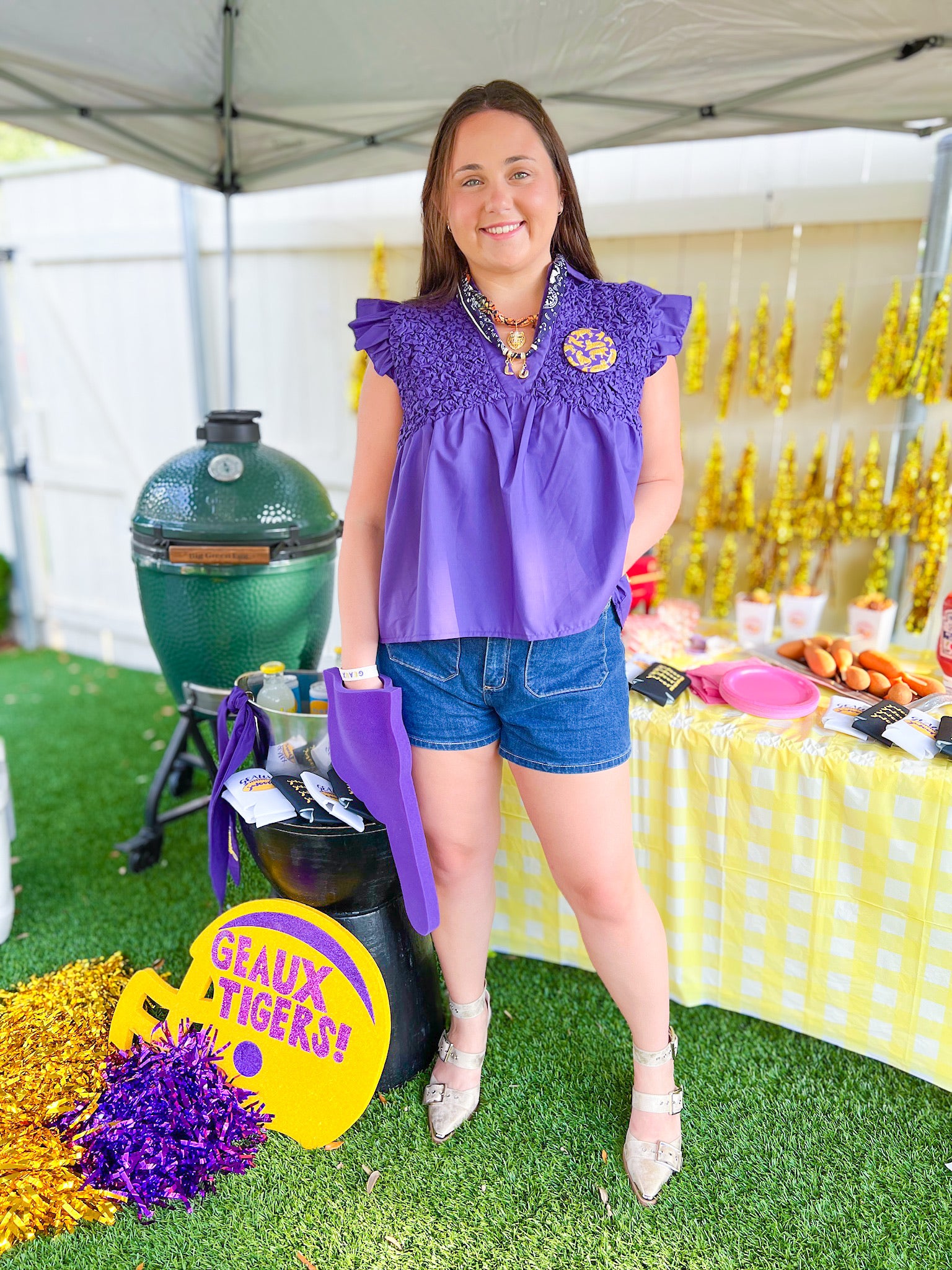 Celebrate game day in style with this popcorn smocking babydoll top! It features charming popcorn smocking, ruffle sleeves, and a flattering V-neck with a collar. The relaxed fit and babydoll silhouette make it both comfortable and cute for any spirited occasion.