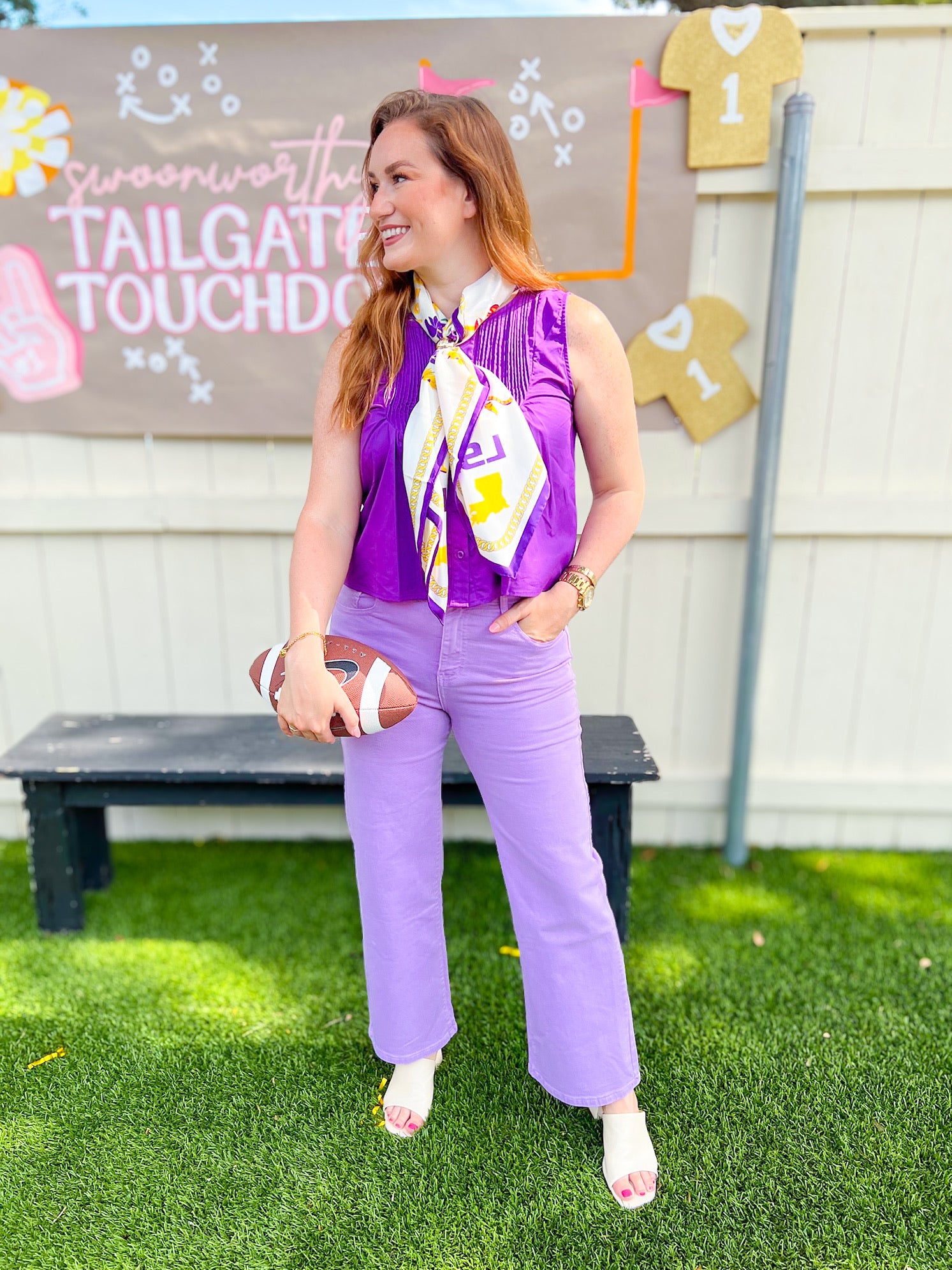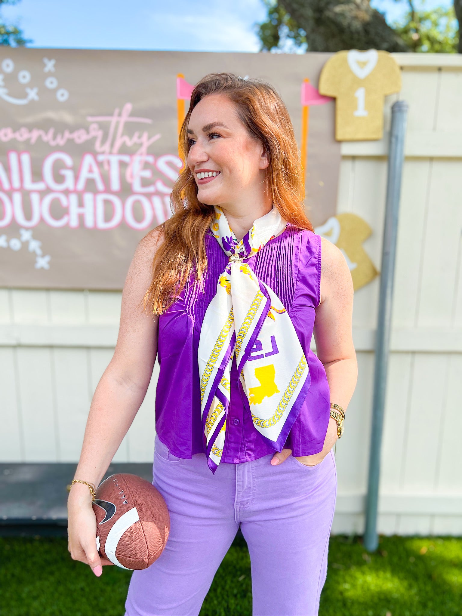 This sleeveless button-down top in vibrant purple features elegant pleated detailing across the chest and a flowy hem that adds movement and style. Perfect for festive occasions or game days, it combines comfort and flair to keep you looking great all day long.