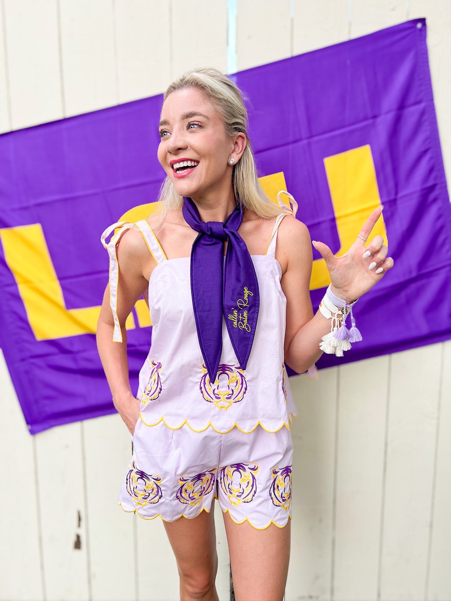 Enjoy a laid-back, slightly boxy silhouette with this two-piece set featuring a sleeveless top and matching shorts. Both pieces showcase scalloped hems, contrast piping, and shoulder ties for a playful touch. Adorned with tiger embroidery on the front and hem, the shorts offer an elastic waistband for comfort. Ideal for game days, football season weekends, or a fun sporty brunch with friends.