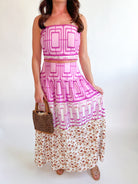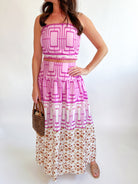 Make a bold statement with this striking geometric printed set. The fitted crop top showcases eye-catching patterns that pair perfectly with the flowing midi skirt, creating an effortlessly chic silhouette. Ideal for brunch dates, night outs, or turning heads wherever you go. Mix modern edge with feminine flair in one coordinated look.