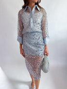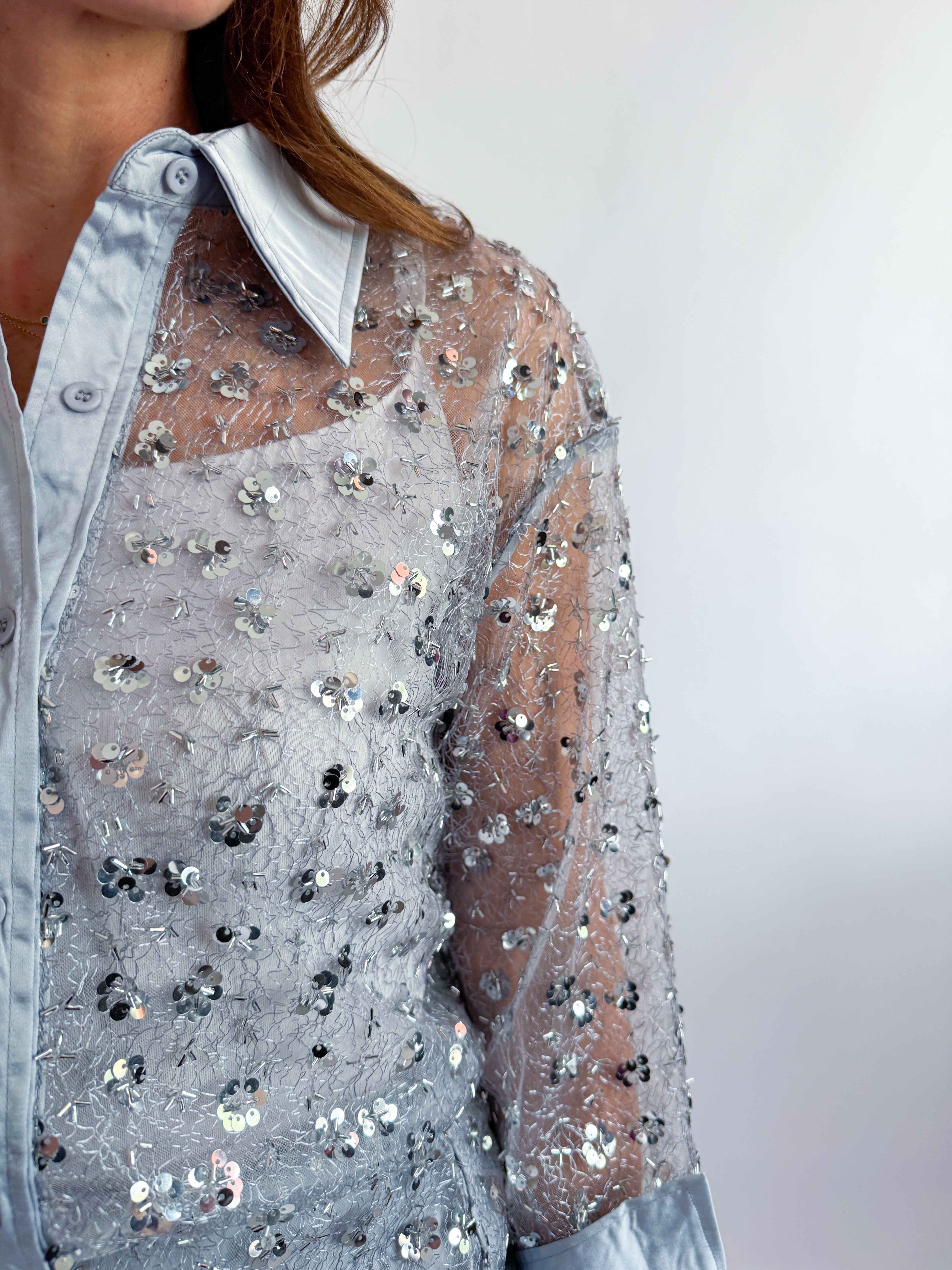 Shimmer and shine in this stunning Blue Slate Sequin Shirt! Covered in eye-catching sequins that catch the light with every move, this piece is perfect for nights out, special occasions, or whenever you want to feel absolutely fabulous. The rich blue slate color adds sophistication while the sequin detailing brings the glam. Whether you're dancing the night away or making an entrance, this shirt guarantees you'll turn heads. Dress it up with tailored pants or keep it fun with your favorite jeans—either way, you're guaranteed to sparkle!
