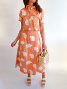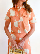 Make a bold statement with this vibrant orange button-down shirt featuring an eye-catching abstract print. The cropped silhouette offers a modern, flattering fit that works beautifully layered or worn solo. Crafted for versatility, it pairs effortlessly with high-waisted jeans, skirts, or trousers for a polished yet playful look. Perfect for adding a pop of color and artistic flair to your everyday wardrobe.