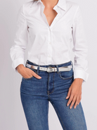 Discover the Eva Metallic Leather Belt, a handmade accessory crafted in The Netherlands from vegetable-tanned full-grain leather for lasting quality. Its sleek 0.8" width pairs perfectly with any outfit, while the shiny silver or gold buckle—nickel-free and imported from Italy—adds a touch of elegant shine. This belt blends craftsmanship and style to elevate your wardrobe with a friendly, exciting flair.