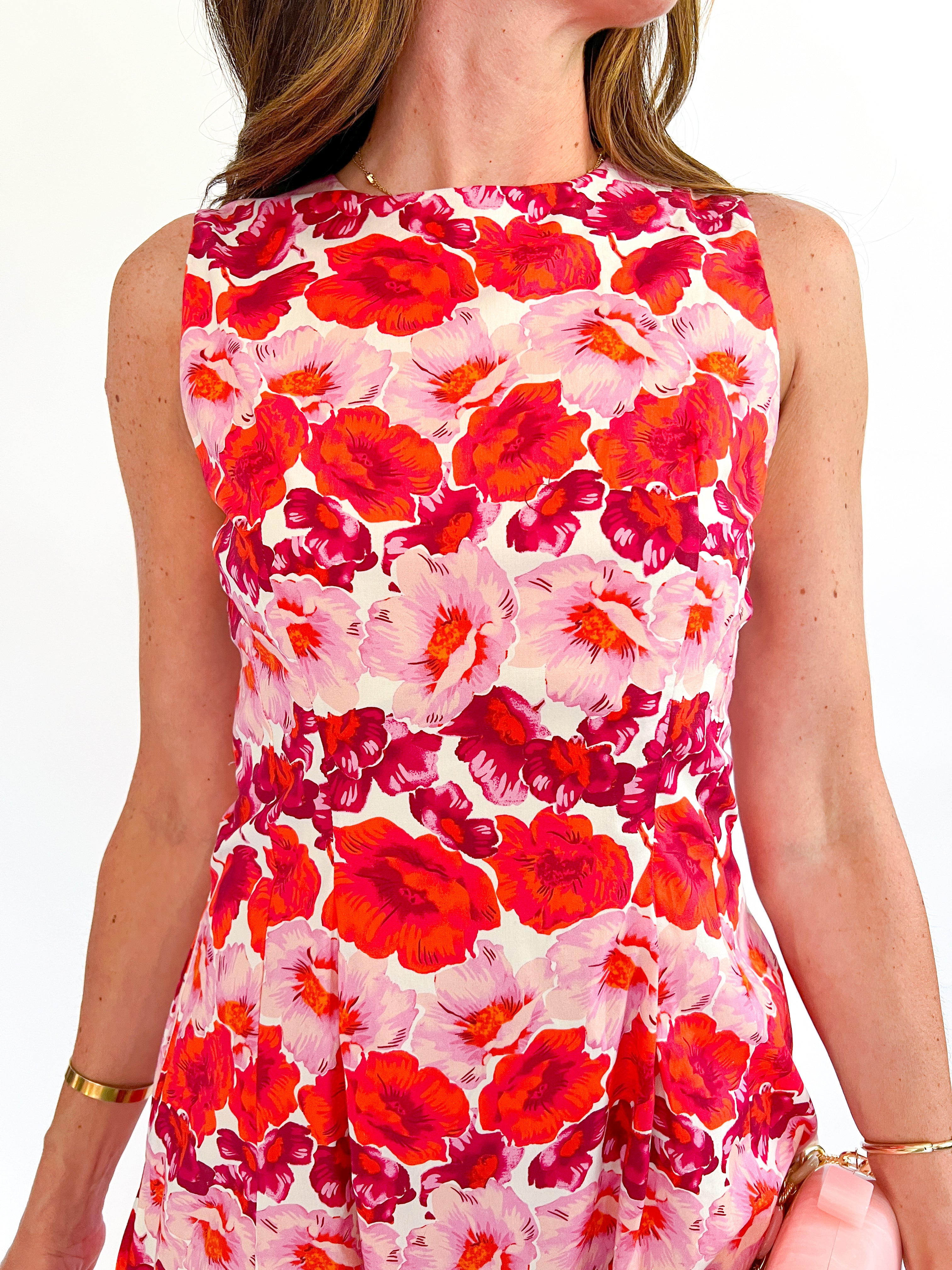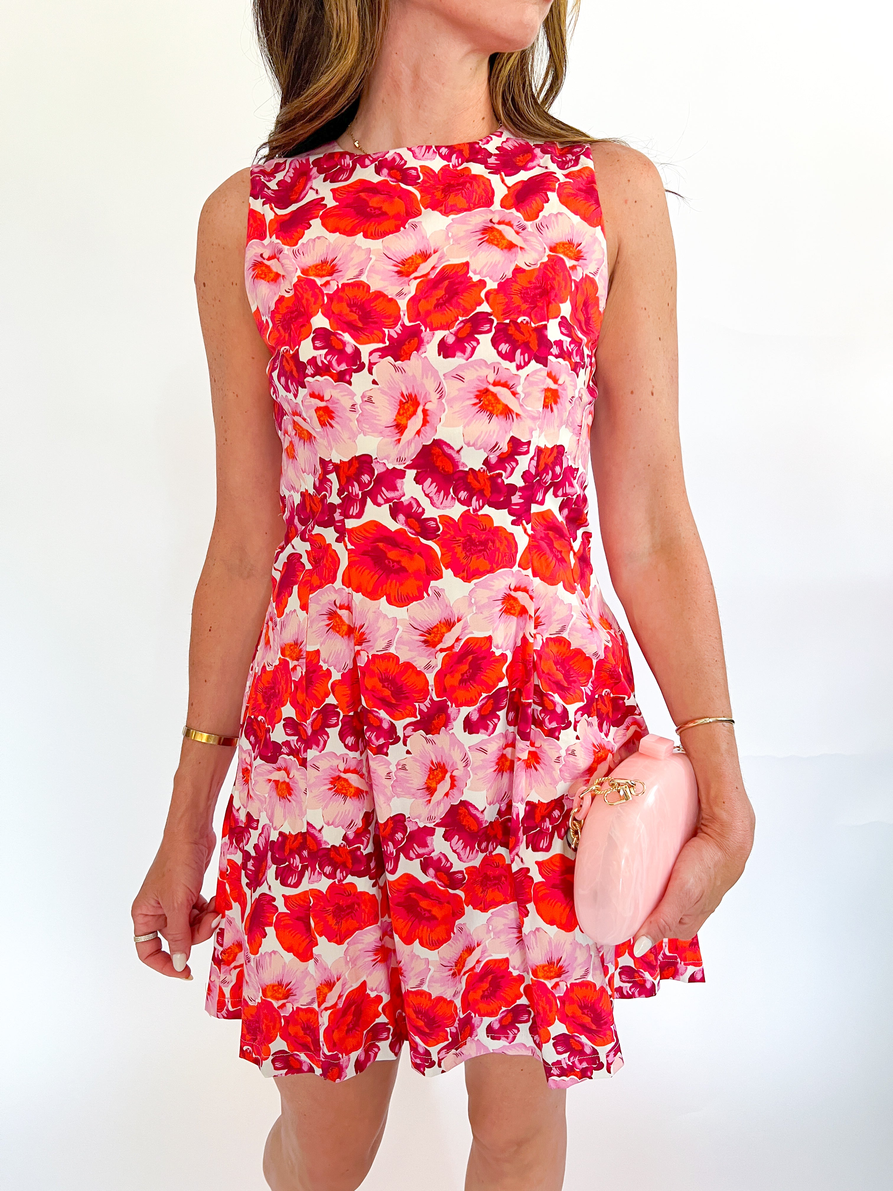 This adorable Ronnie Floral Print Mini Dress is perfect for sunny days! Features a flattering crew neck and sleeveless design with a pleated waist that creates a gorgeous silhouette. Practical side pockets and easy back zipper make it as functional as it is cute. Fully lined for comfort with a beautiful floral pattern that's sure to turn heads wherever you go!