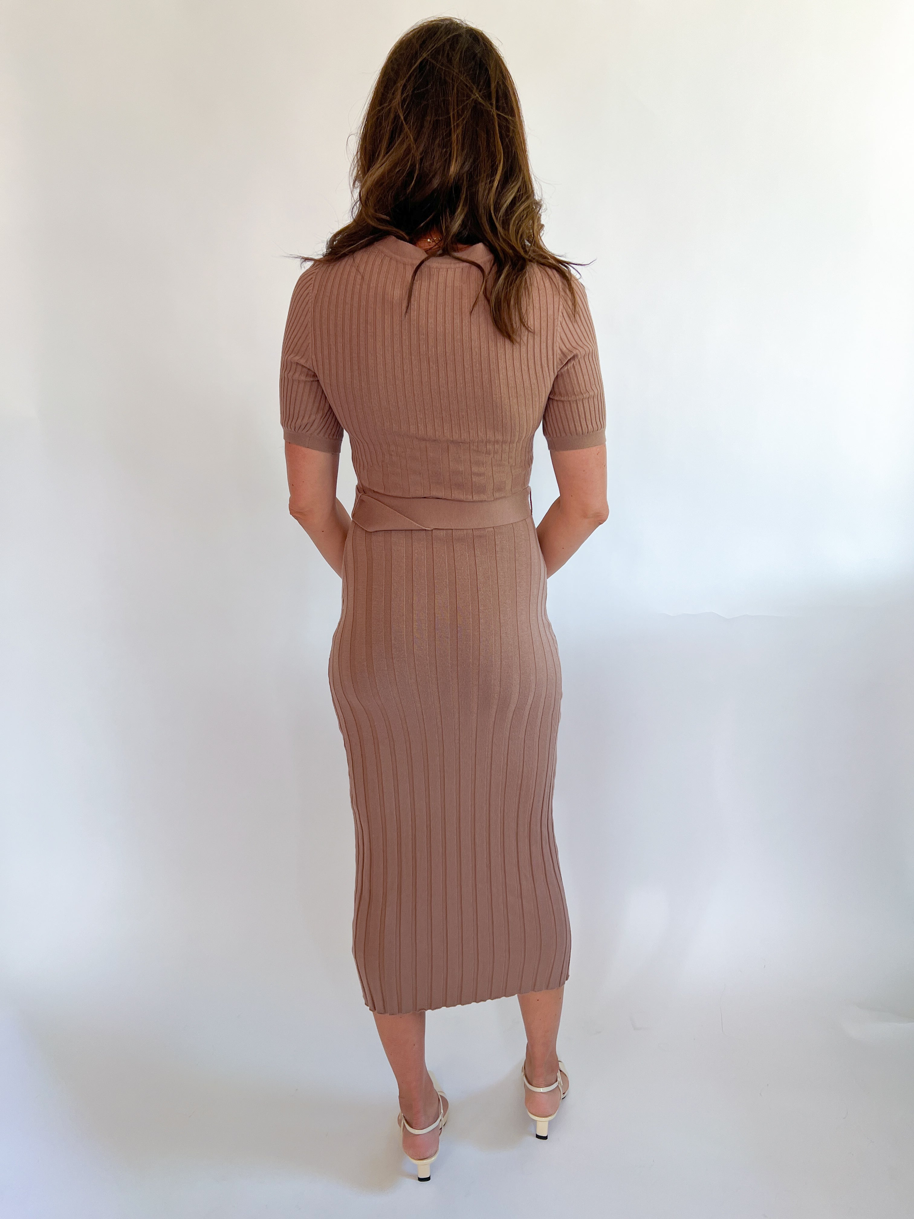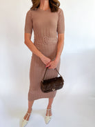 This ribbed midi sweater dress combines cozy comfort with stylish details. It features a flattering round neckline, short sleeves, and a chic shoulder tab secured with a button for a touch of flair. The included self-tie belt allows you to define your waist, creating a perfect silhouette for any occasion. With its versatile design, this dress is an exciting addition to your wardrobe, blending warmth and fashion effortlessly.