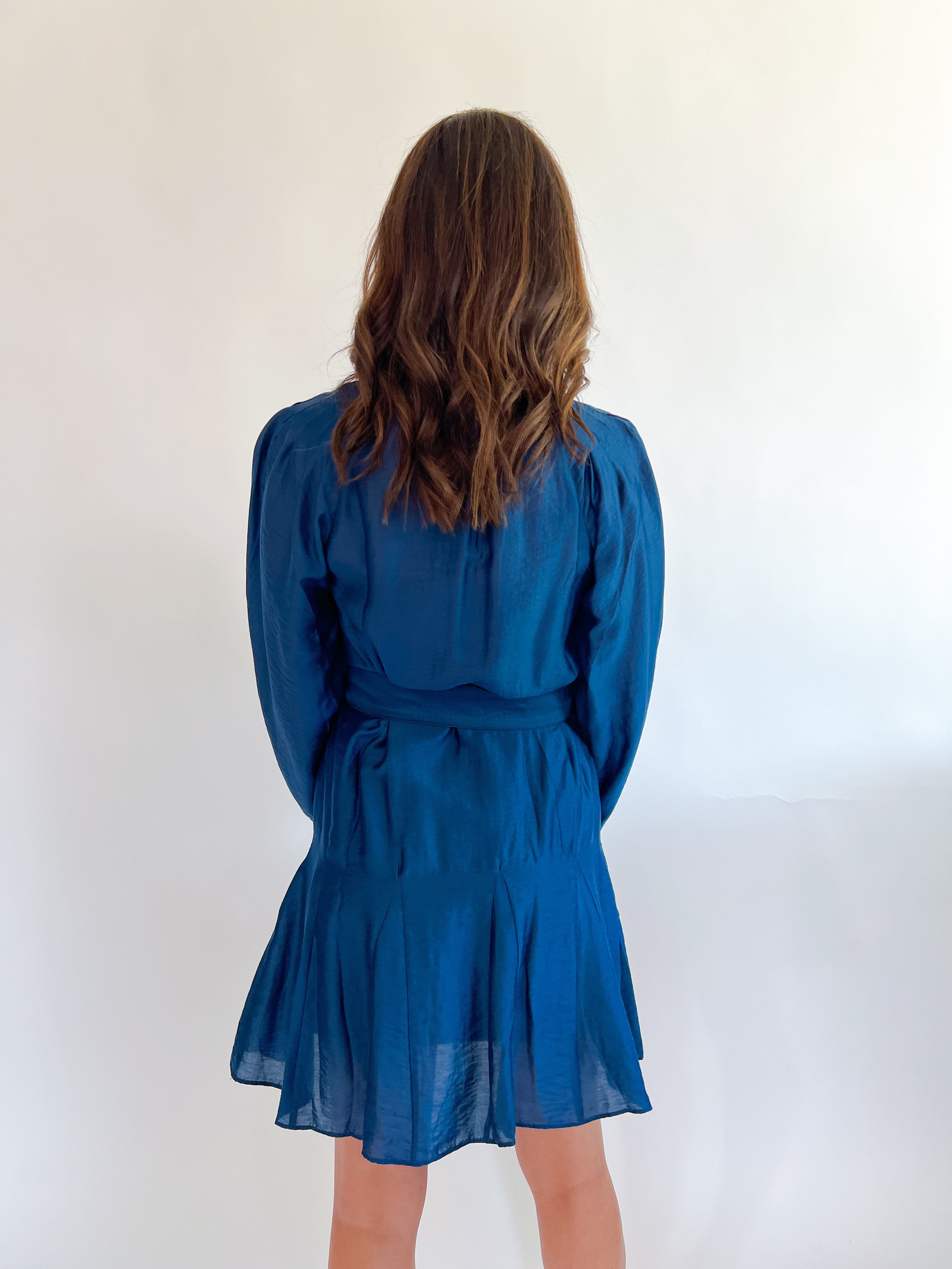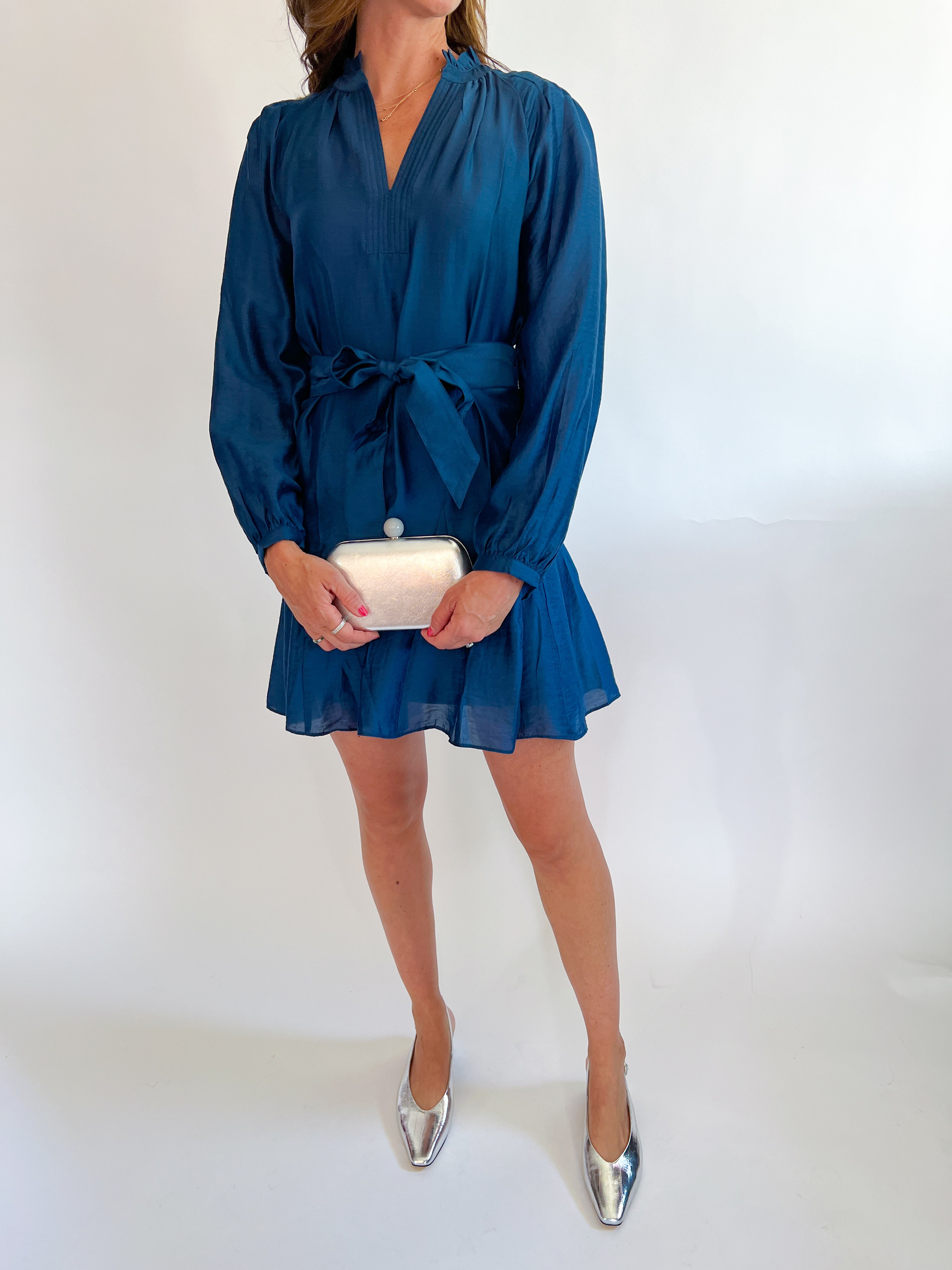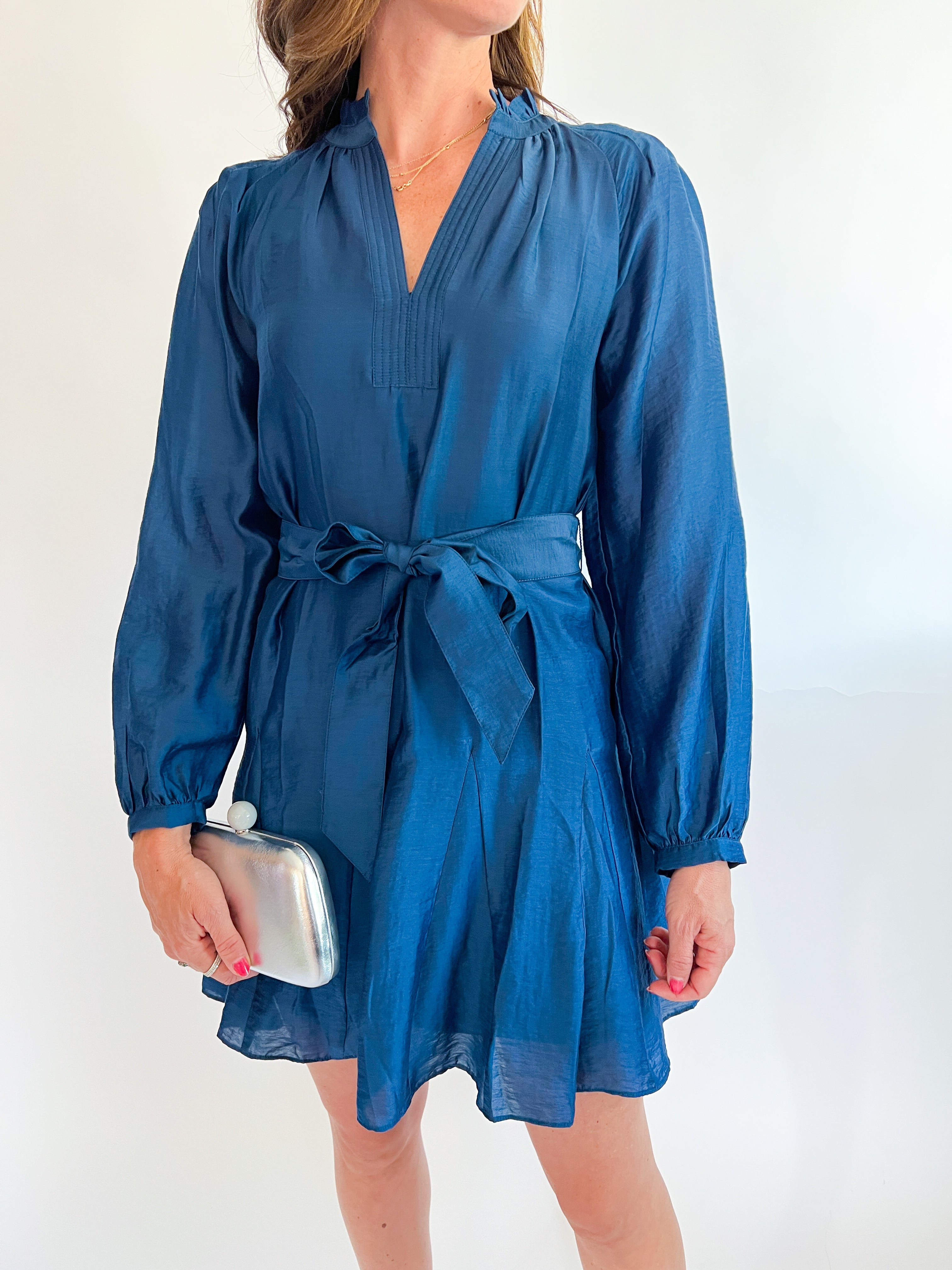 This dress features a charming ruffled collar and a split neckline, complemented by long sleeves with buttoned cuffs. It includes a self-tie waist belt and a flared mini skirt enhanced with godet details. Made from a lightweight, flowy fabric, it offers a breezy and comfortable fit perfect for any occasion.