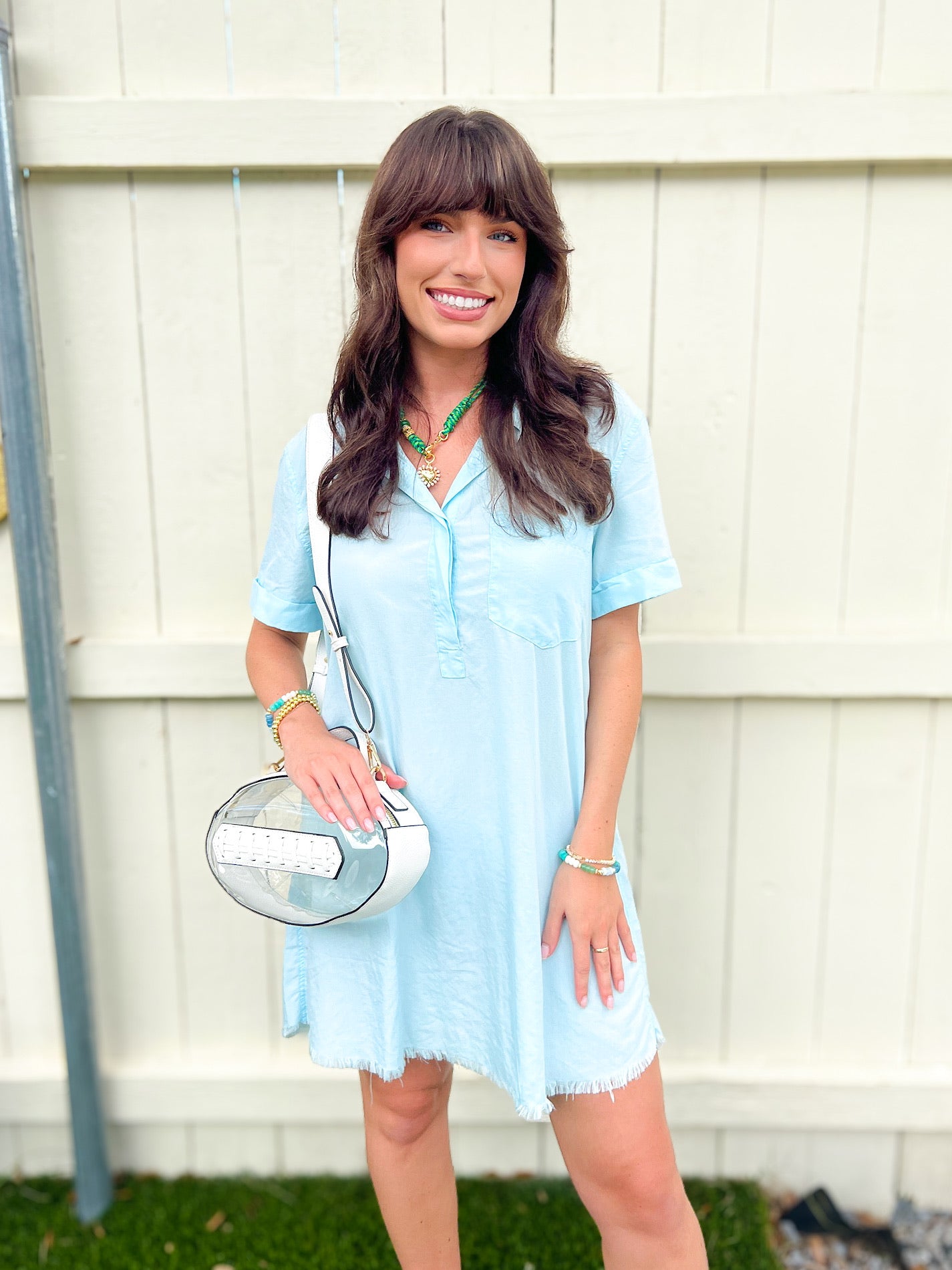 Embrace effortless style with this Sky Blue Washed Dress. Featuring a classic collar, short sleeves, and a covered half-button front, it offers a fresh take on the mini shirt dress. The relaxed fit and front chest pocket add casual charm, while the washed sky blue color brings a soft, breezy vibe perfect for any sunny day.
