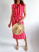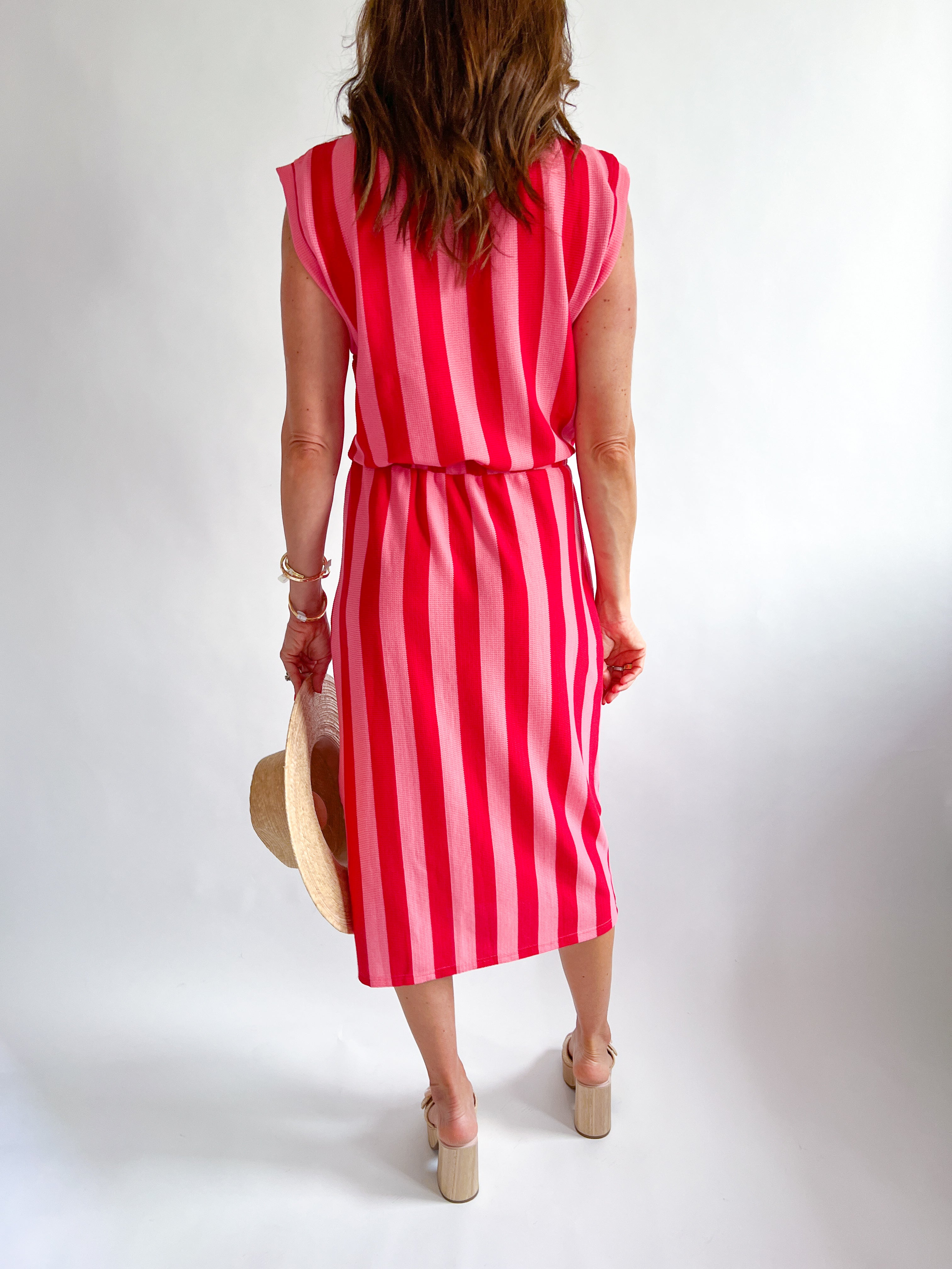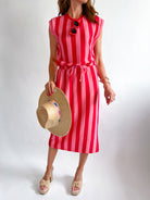 Elevate your everyday wardrobe with this charming pink striped knit midi dress. Crafted from soft, breathable knit fabric, it features classic vertical stripes that flatter any figure. The midi length offers versatile styling—dress it up with heels for a night out or keep it casual with sneakers for weekend errands. Perfect for layering with cardigans or jackets as seasons change. A timeless piece that transitions seamlessly from day to night.