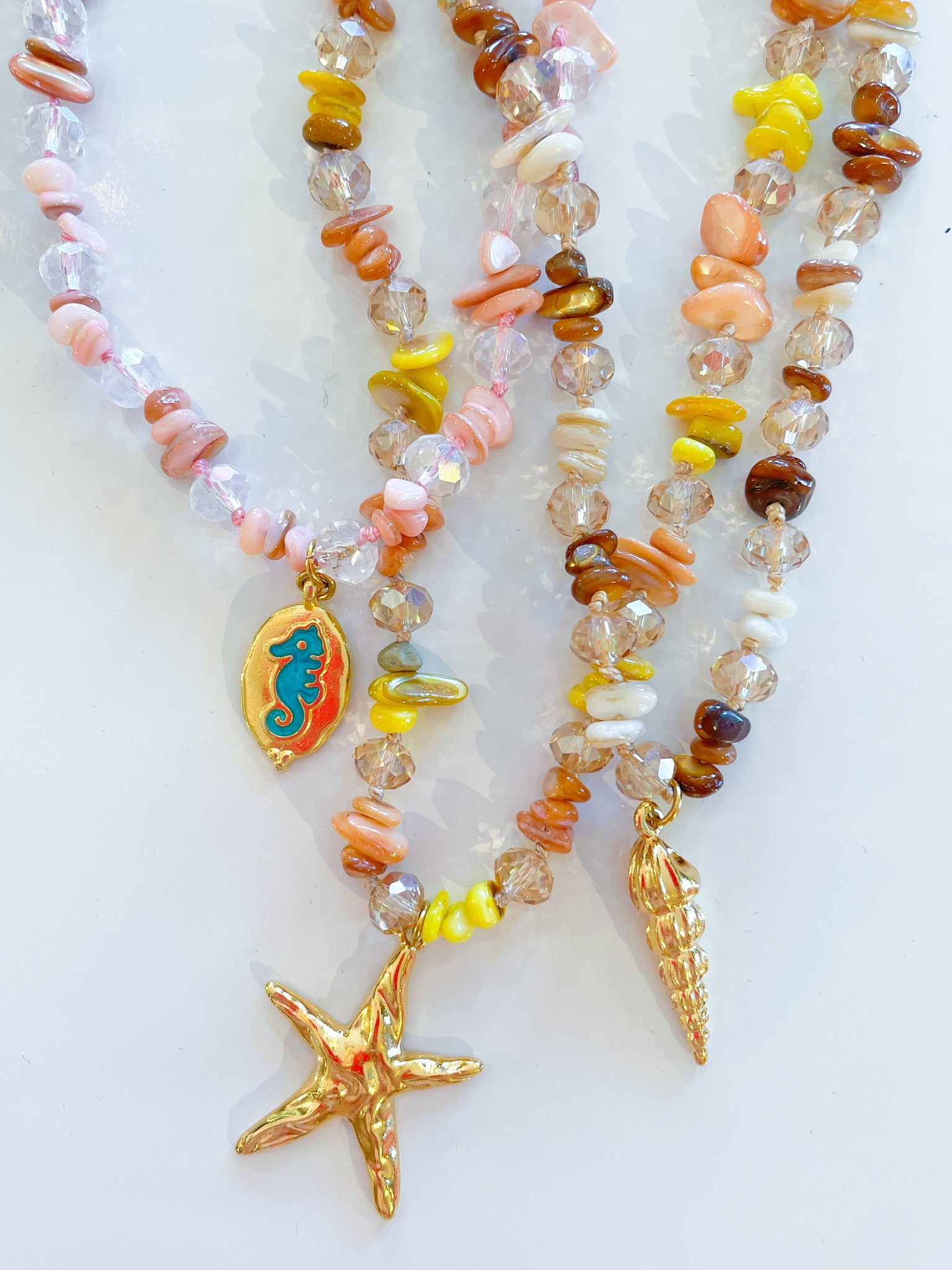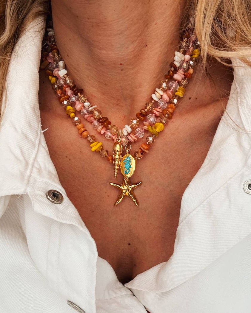 Enjoy the vibrant mix of our Multicolor Beaded Semiprecious Chips Necklaces, featuring inner shell chips, crystals, and 24k gold-plated copper accents for a dazzling, unique look.