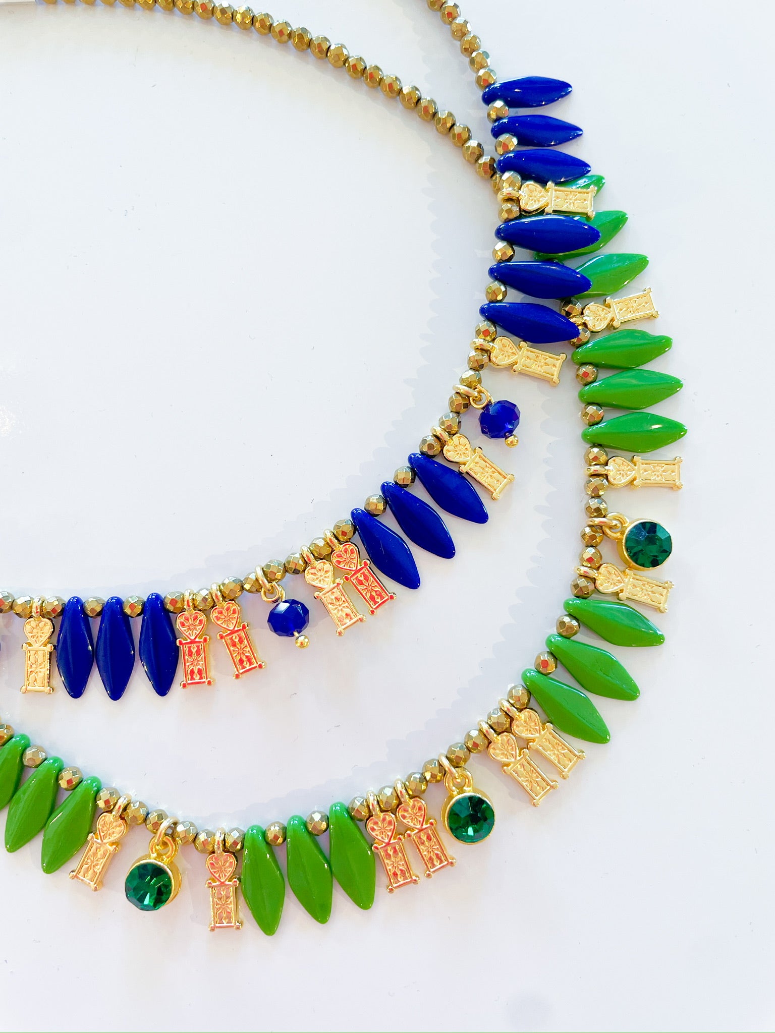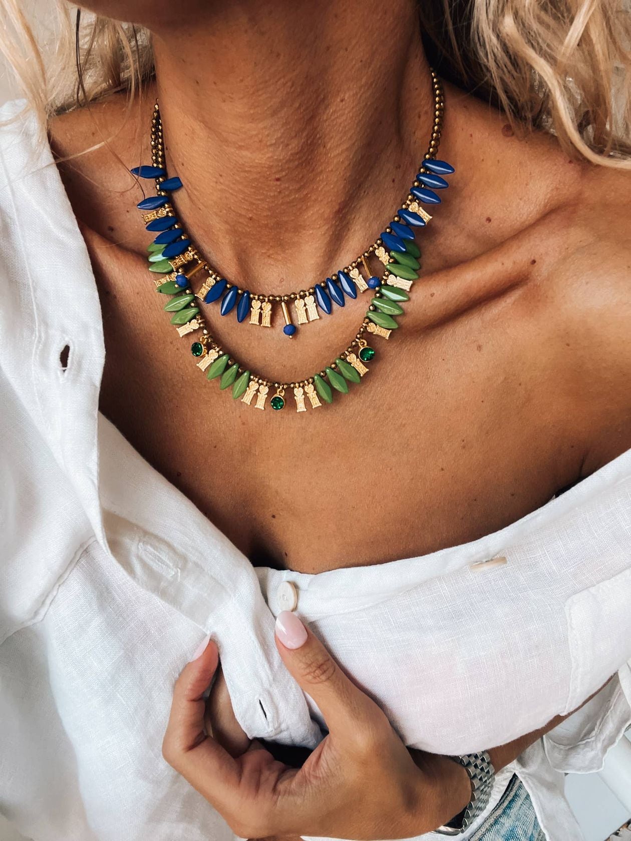 Discover the vibrant charm of our Gold Layering Beaded Necklaces featuring stunning blue and green beads, perfect for adding a playful and stylish touch to any outfit.