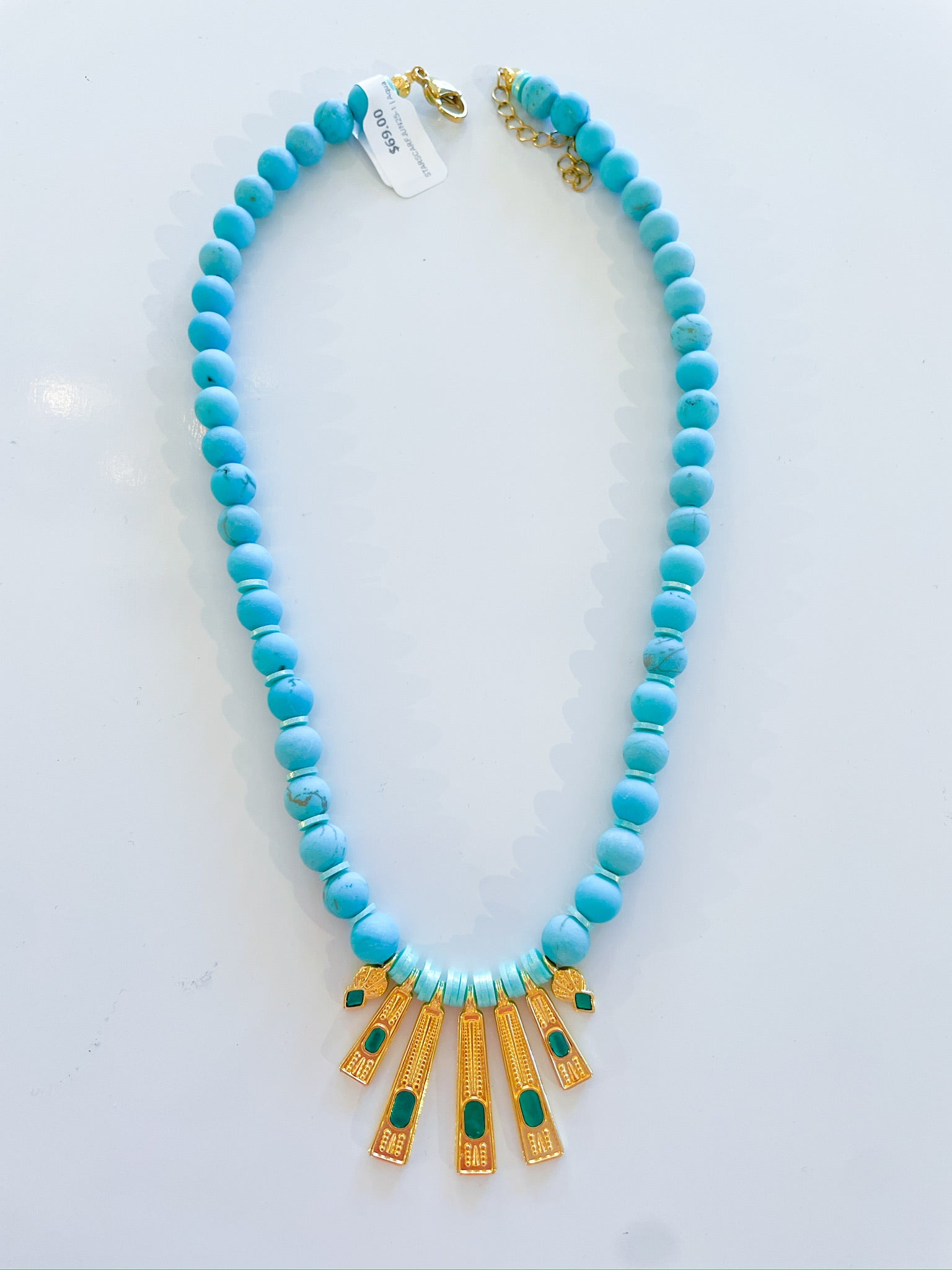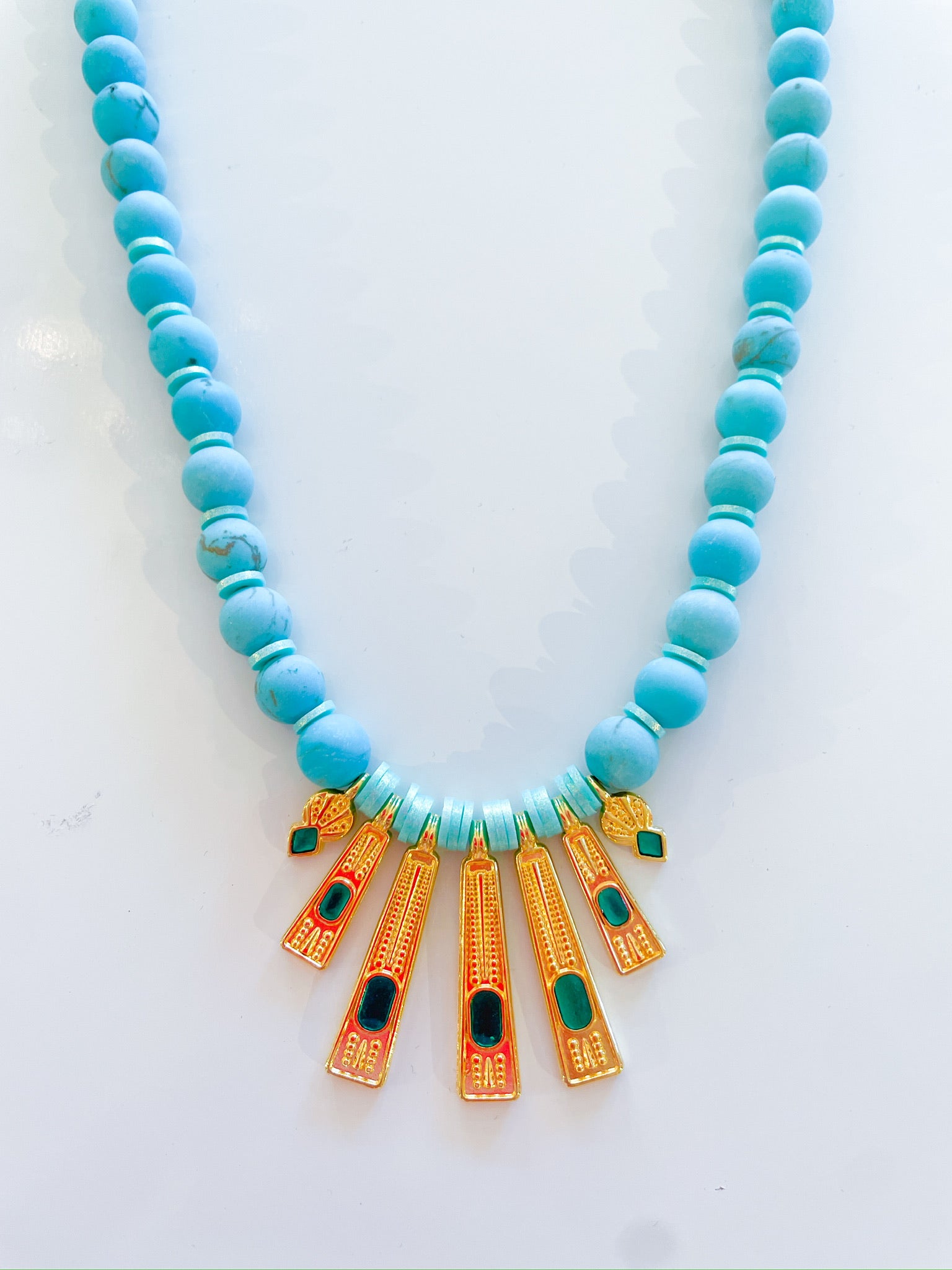 Dive into summer style with this stunning aqua and gold layered necklace set. One strand features smooth semiprecious howlite beads with gold accents, while the second is a vibrant scarf bandana necklace finished with an eye-catching gold starfish charm. The perfect combo for beach lovers, coastal vibes, and effortless statement layering.