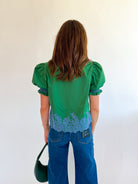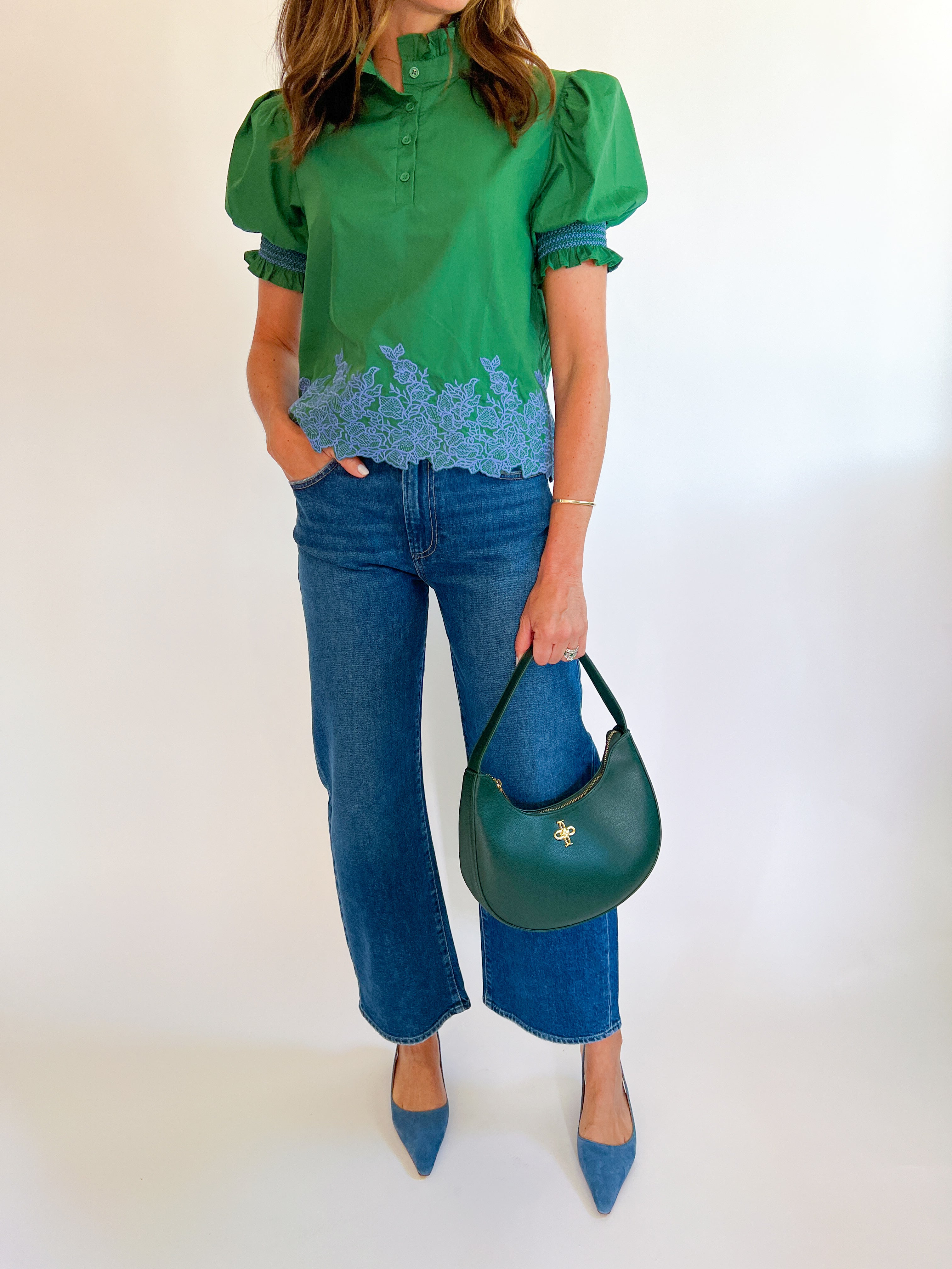 The Izzy Embroidered Hem Top showcases a solid color with embroidered border details along the hem and smocked cuff bands on the short sleeves. It features a ruffled band collar with a button closure and is made from lightweight woven fabric that’s unlined and non-sheer for a comfortable, breathable wear.