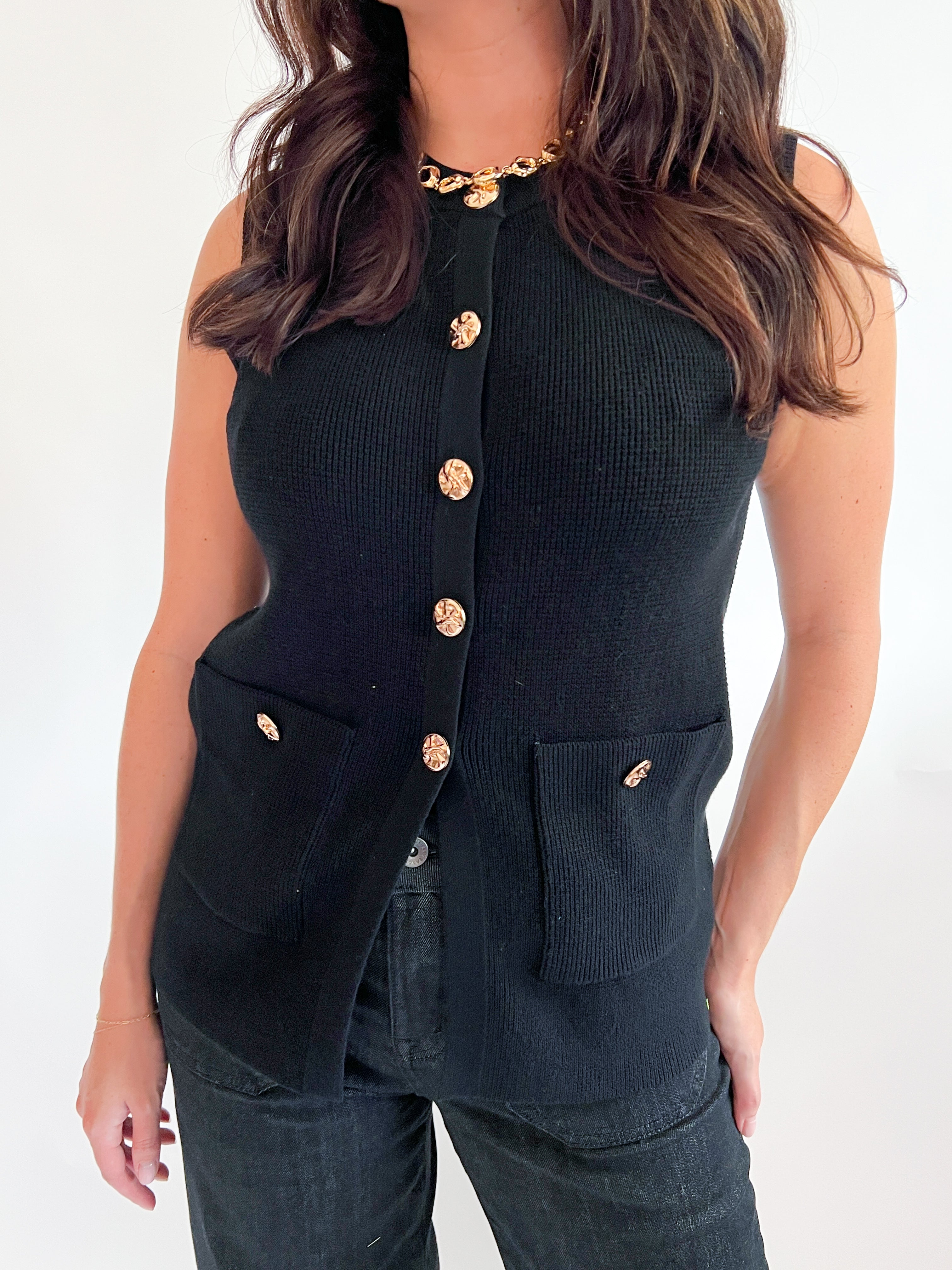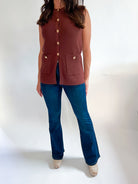 Add a touch of elegance to your wardrobe with our Lori Gold Button Up Vest! This stylish sleeveless piece features a flattering crew neck and dazzling gold button front closure that catches the light beautifully. Two convenient front pockets with matching buttons add both function and flair! Crafted from soft, comfortable knit fabric and designed without lining for breathable wear. Get ready to turn heads and receive compliments wherever you go!