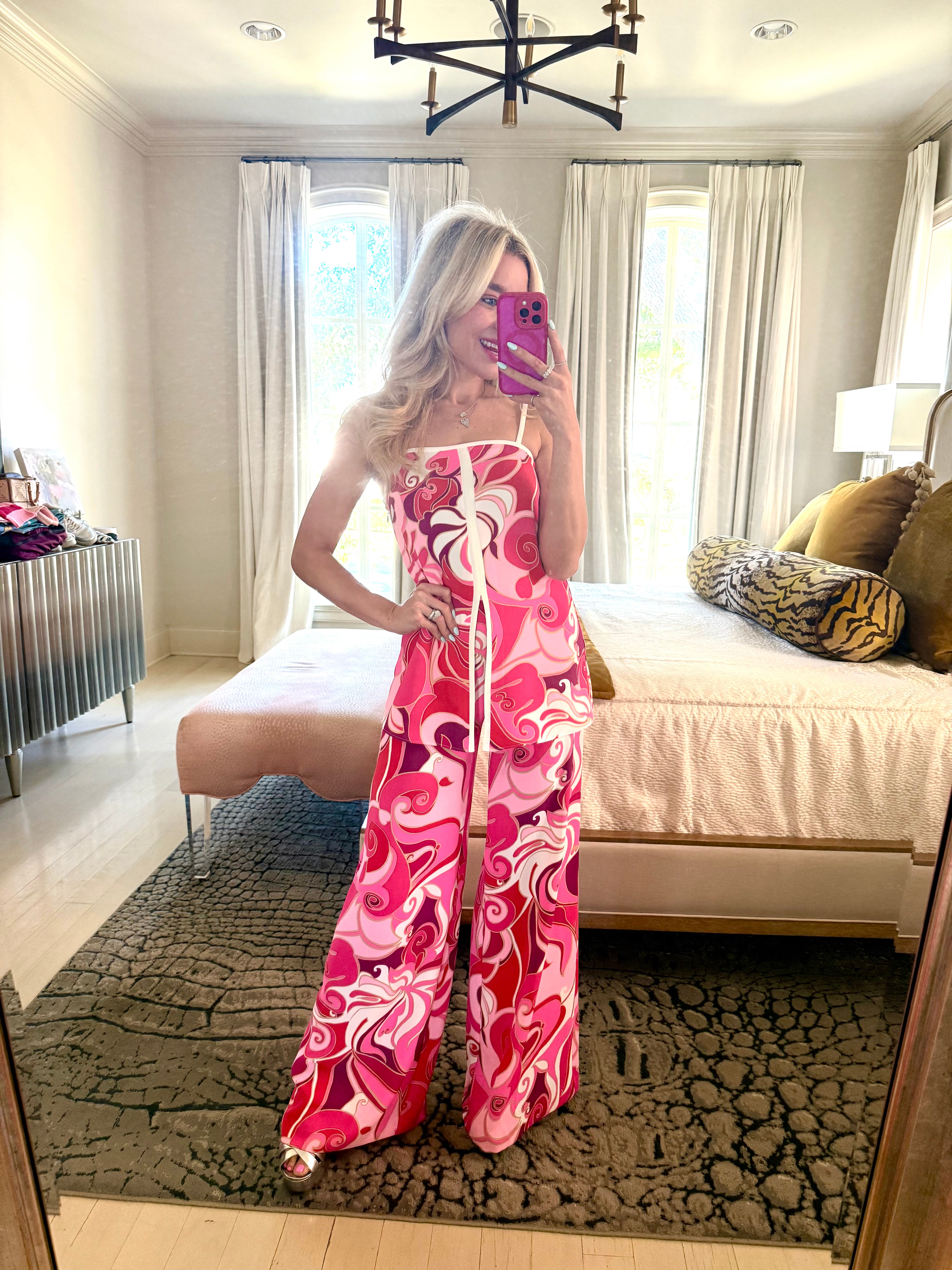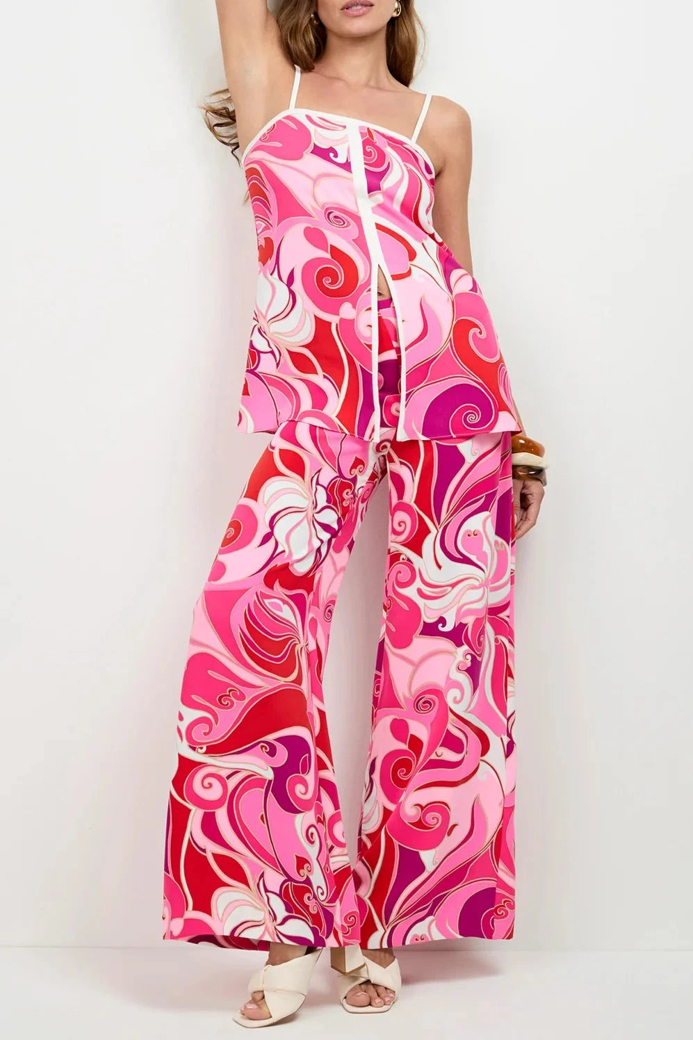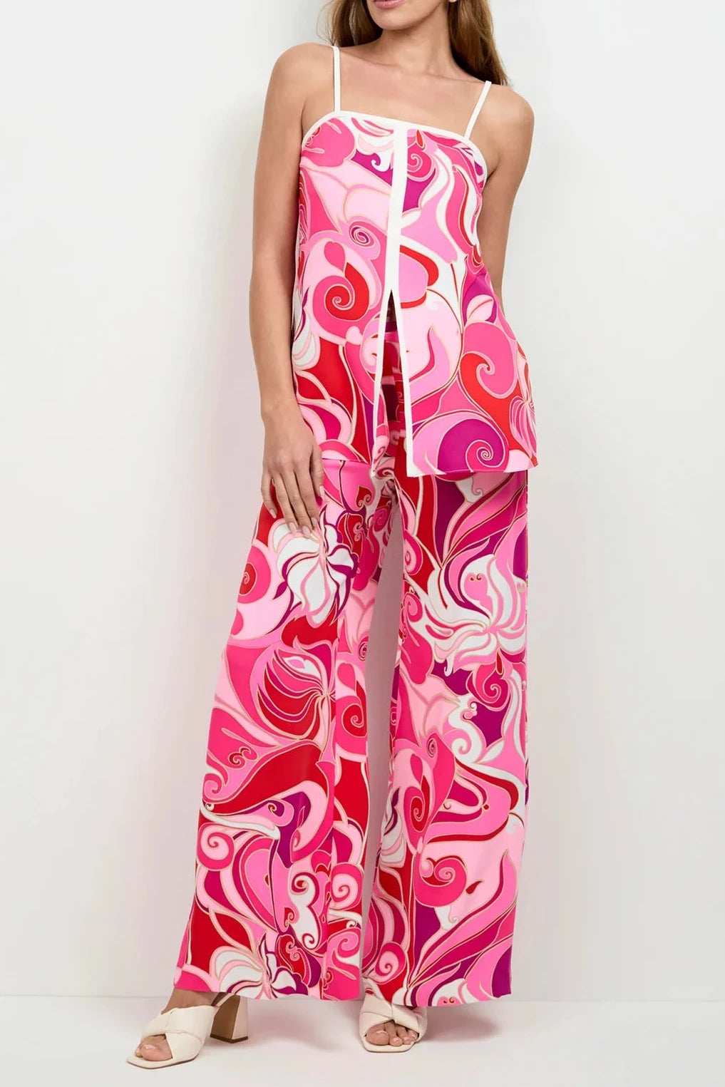 Long on drama, this strappy tunic top is made of lightweight double georgette with a swirling graphic pattern. It's accented by contrast details, and it has a slit at the center hem that allows it to flutter and flow.