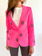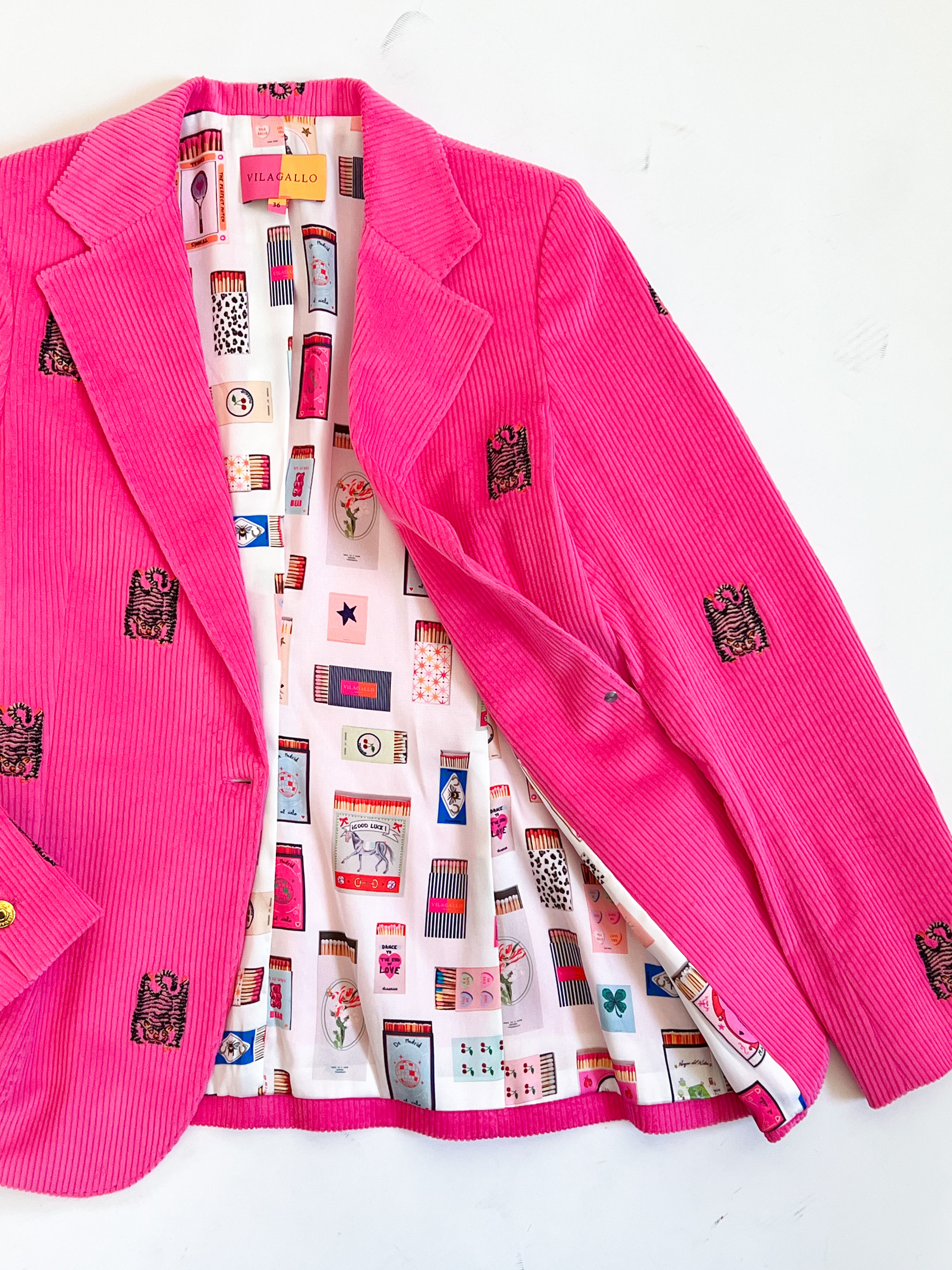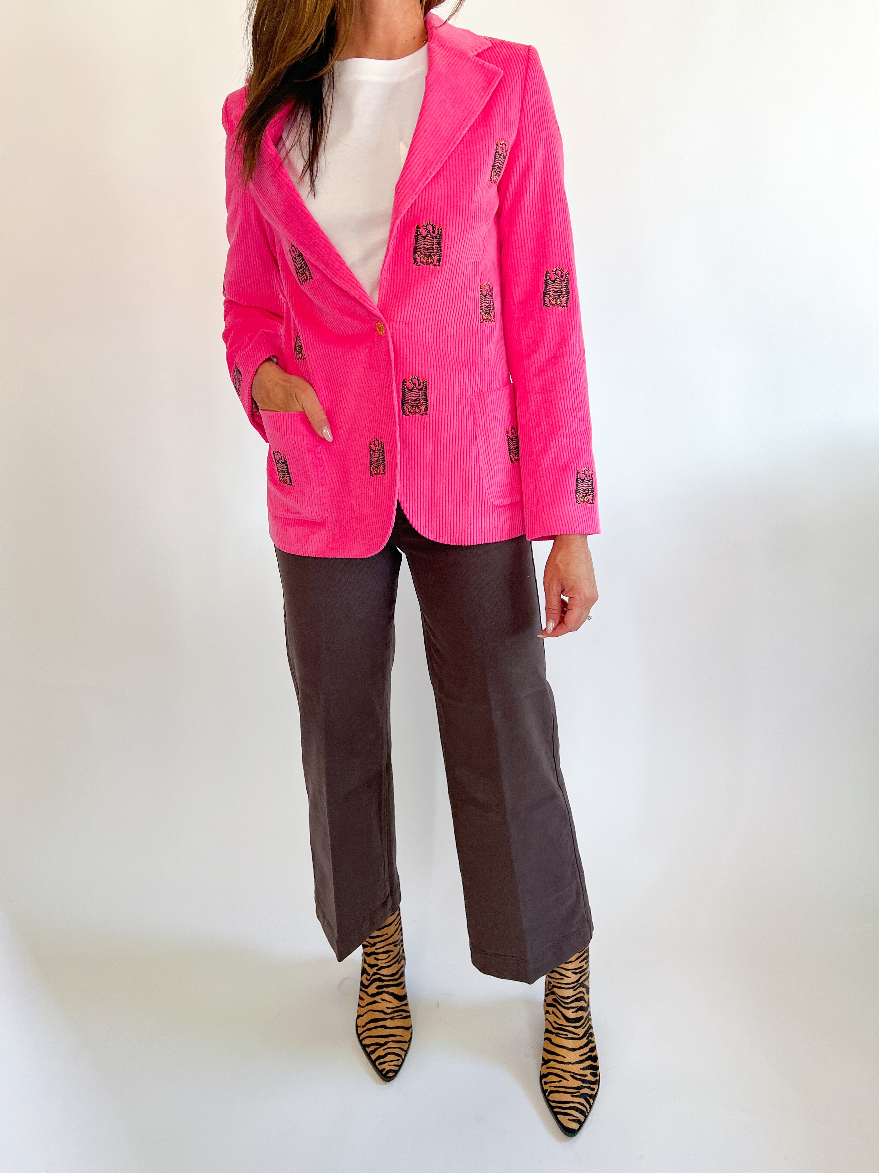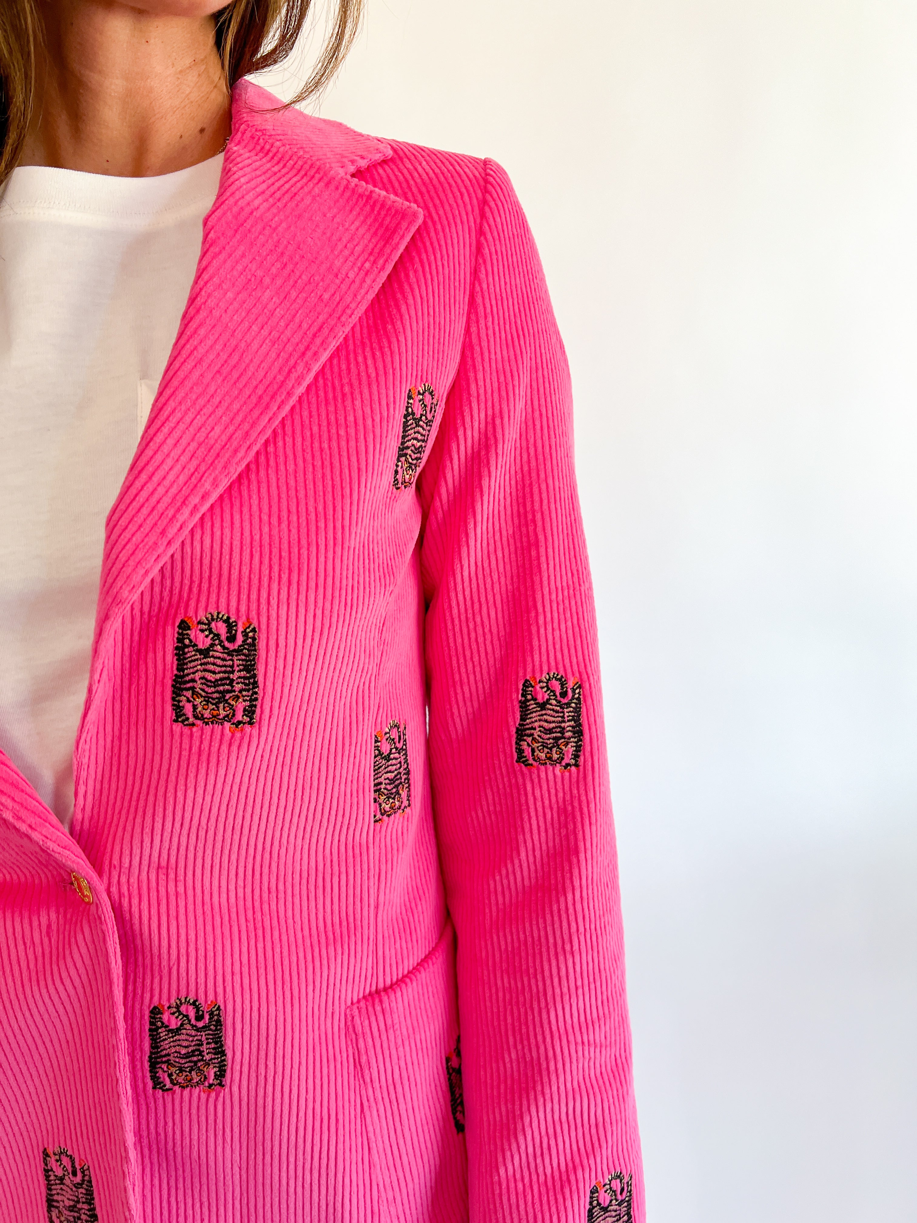 This vibrant fuchsia corduroy blazer is adorned with striking orange and black tiger embroidery on the front, sleeves, and back. It offers a straight fit with a timeless notched lapel, a single gold button closure, and handy front patch pockets. Inside, you'll find a playful printed lining. Enjoy the perfect mix of a structured silhouette and the cozy softness of corduroy.