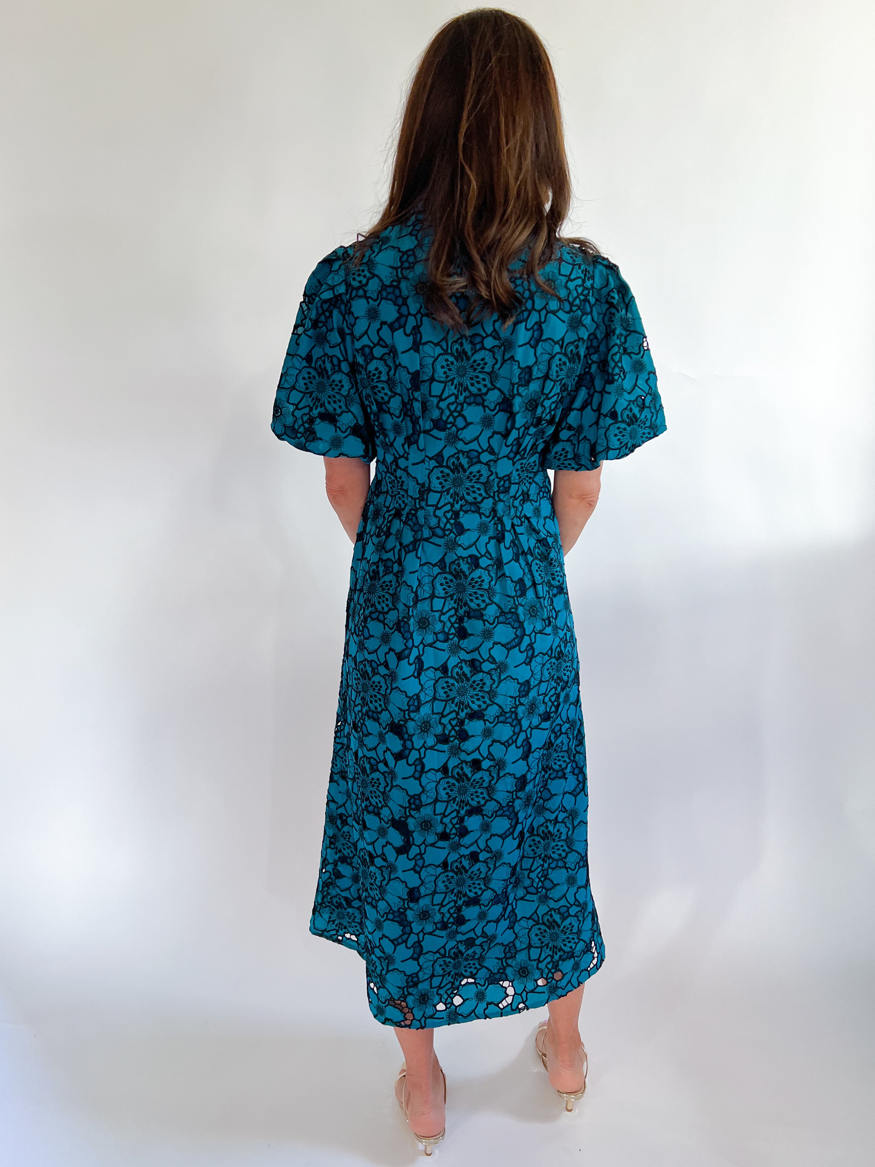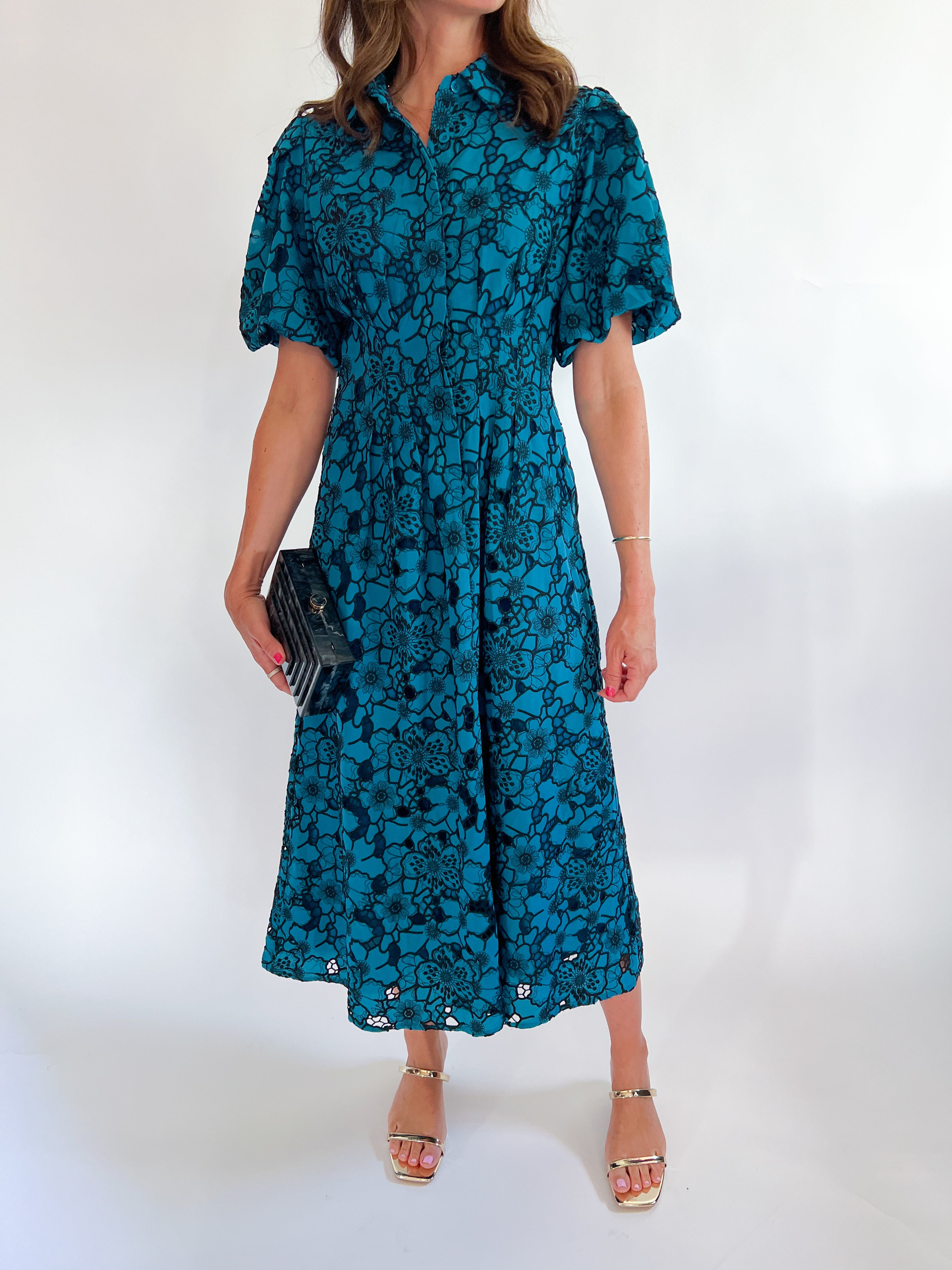 The Angie Floral Midi Dress combines a classic collar with playful short puff sleeves for a fresh, feminine look. Featuring a hidden half button front closure and elegant pleated waist detail, it flatters your silhouette beautifully. The delicate floral eyelet design and full lining ensure both style and comfort, making this dress perfect for any sunny day or special event. Step out with confidence and charm in this delightful midi dress!