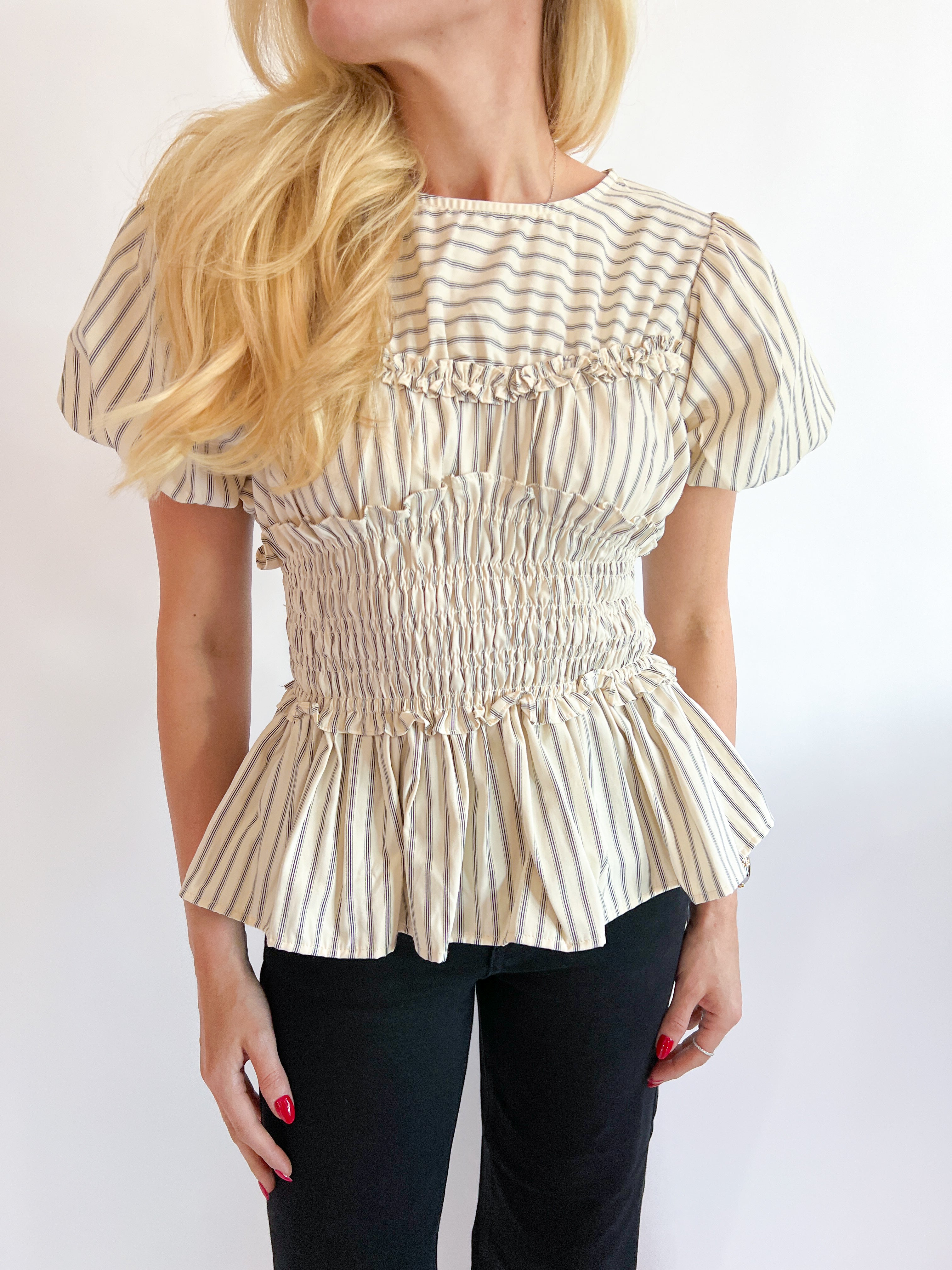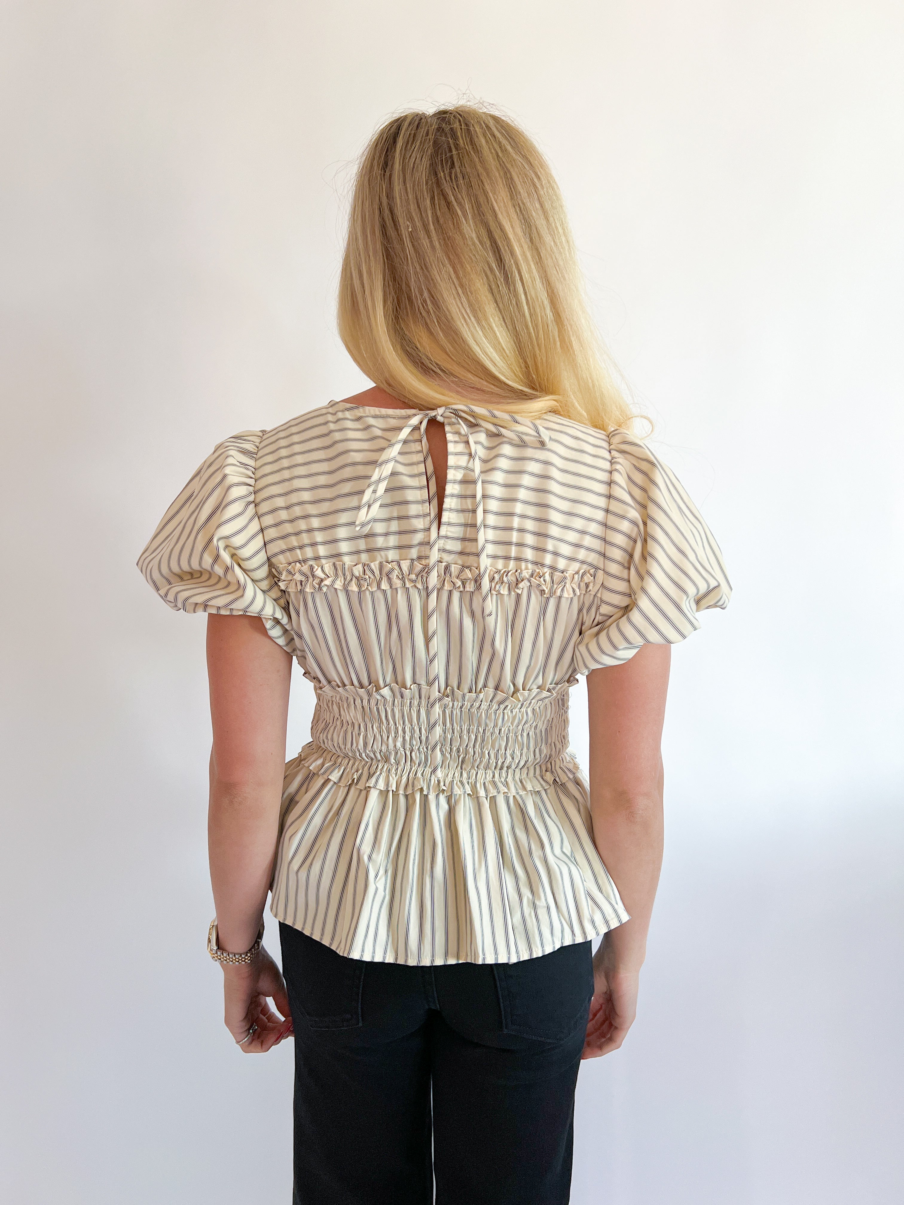 The Azra Puff Sleeve Top features charming puffed short sleeves and a smocked bodice with a matching smocked back for a comfortable, fitted feel. A back keyhole with tie closure adds a delicate touch, while the flutter hem brings playful movement to your look.