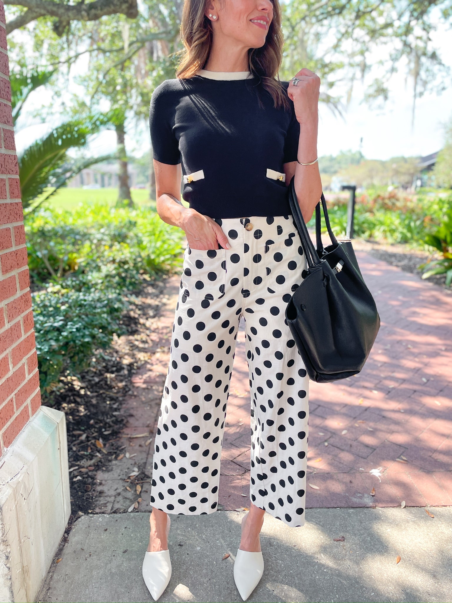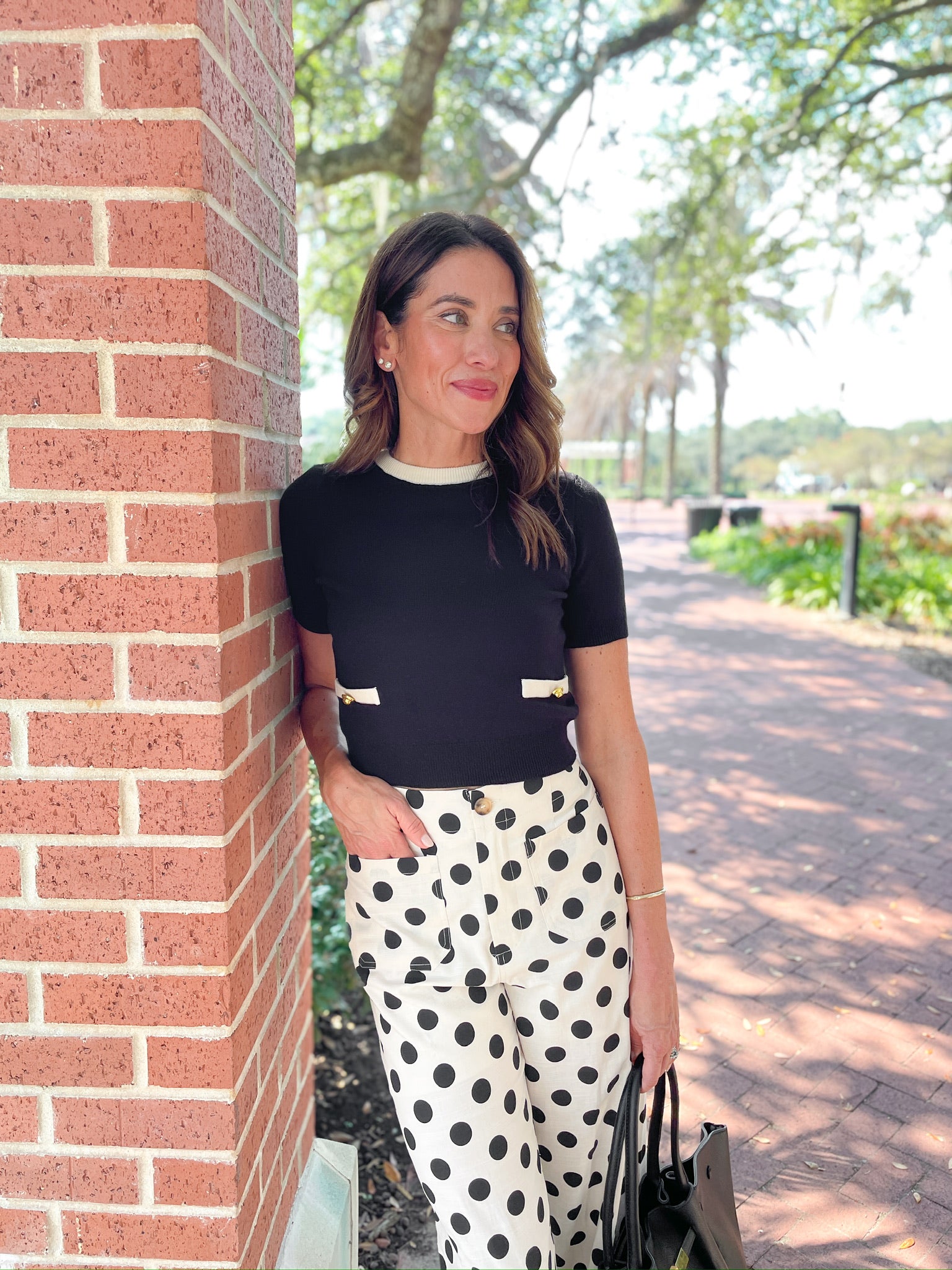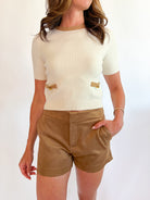 Introducing our Babysoft Short Sleeve Top, perfect for adding a touch of charm to your wardrobe. Crafted from a soft, lightweight knit, it features elegant brown trim along the neckline and two front facing pockets for a classic contrast. This sweater effortlessly blends comfort with chic, making it an ideal choice for any occasion.