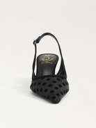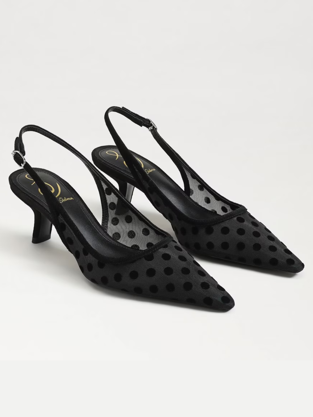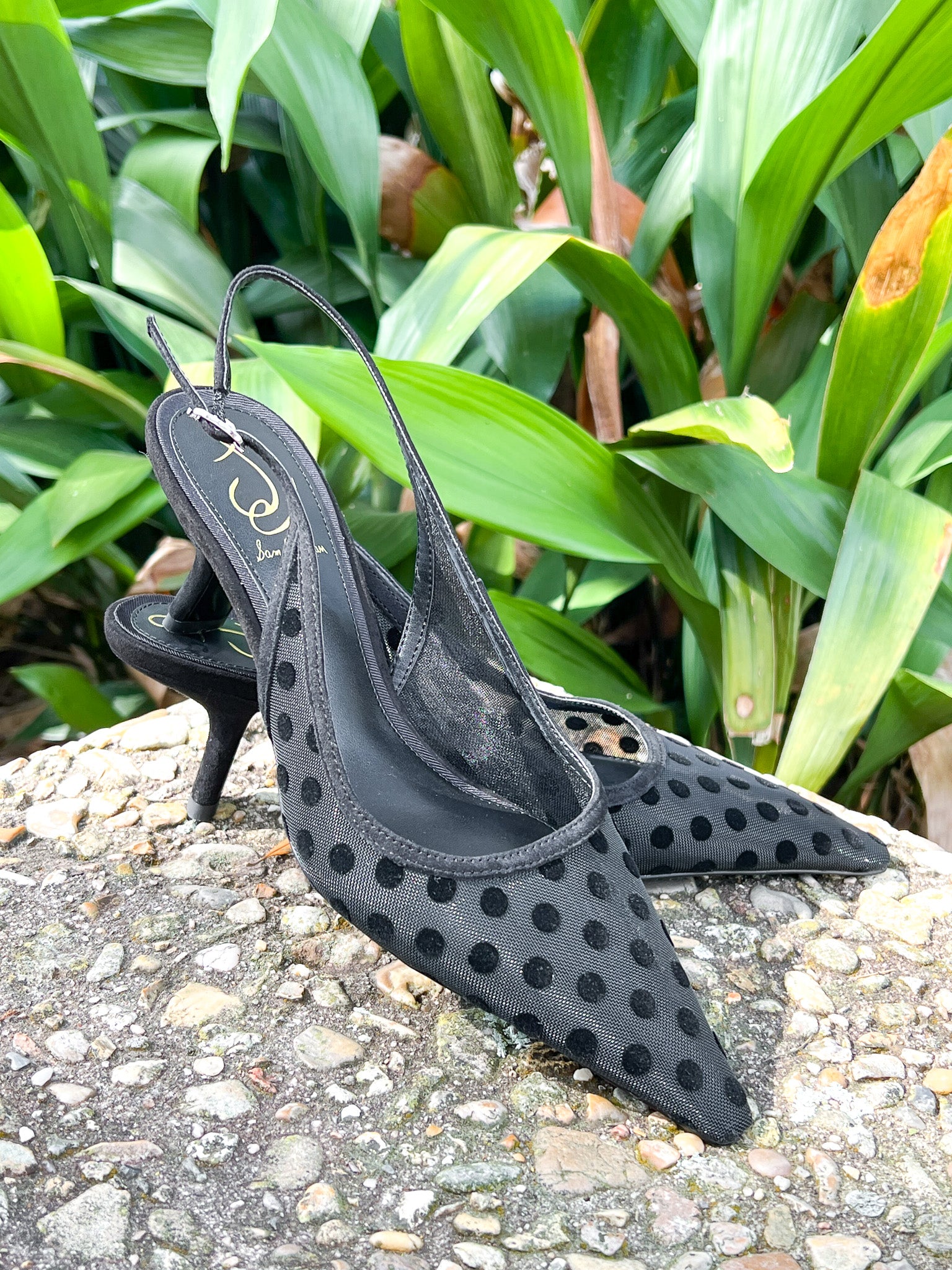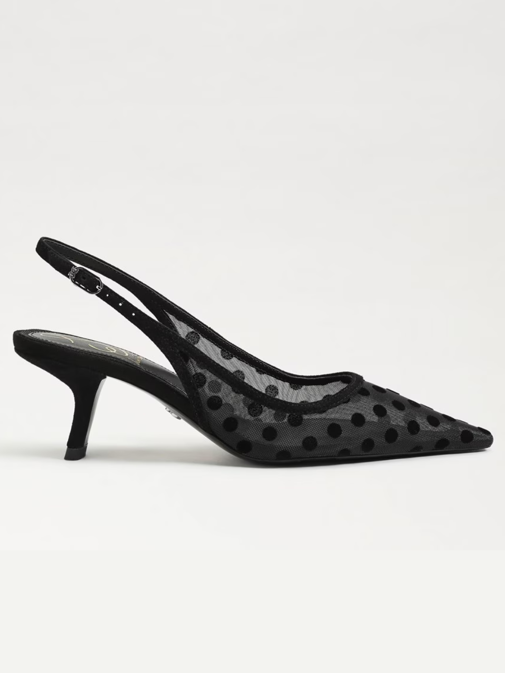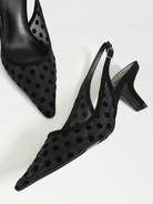 Step into fun sophistication with the Bianka Black Mesh Polka Dot Slingback. Featuring playful polka dots on sheer mesh and a chic contrast trim, these pointed-toe slingbacks bring a surprising pop of personality to your tailored looks. With a comfortable 2.4-inch heel and secure buckle closure, they're ready to elevate your style from day to night.