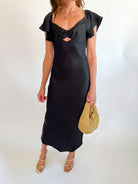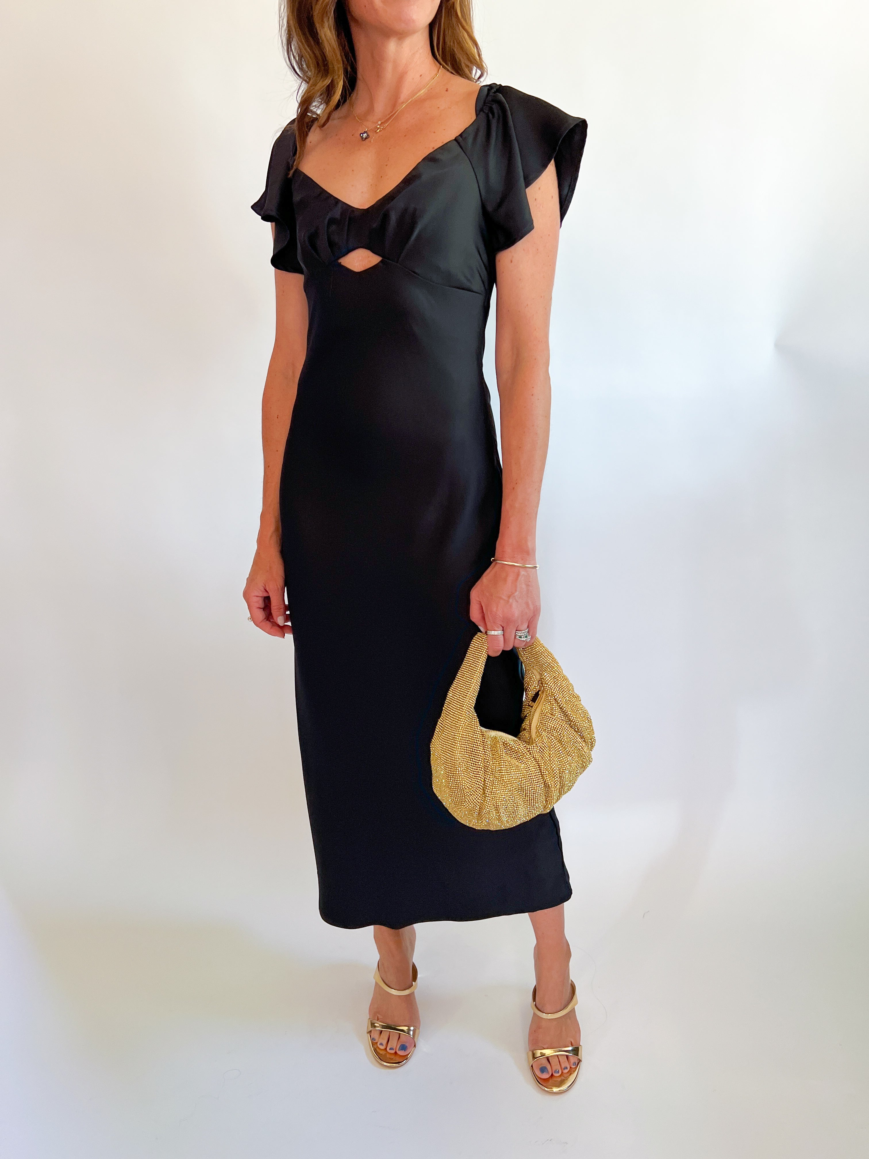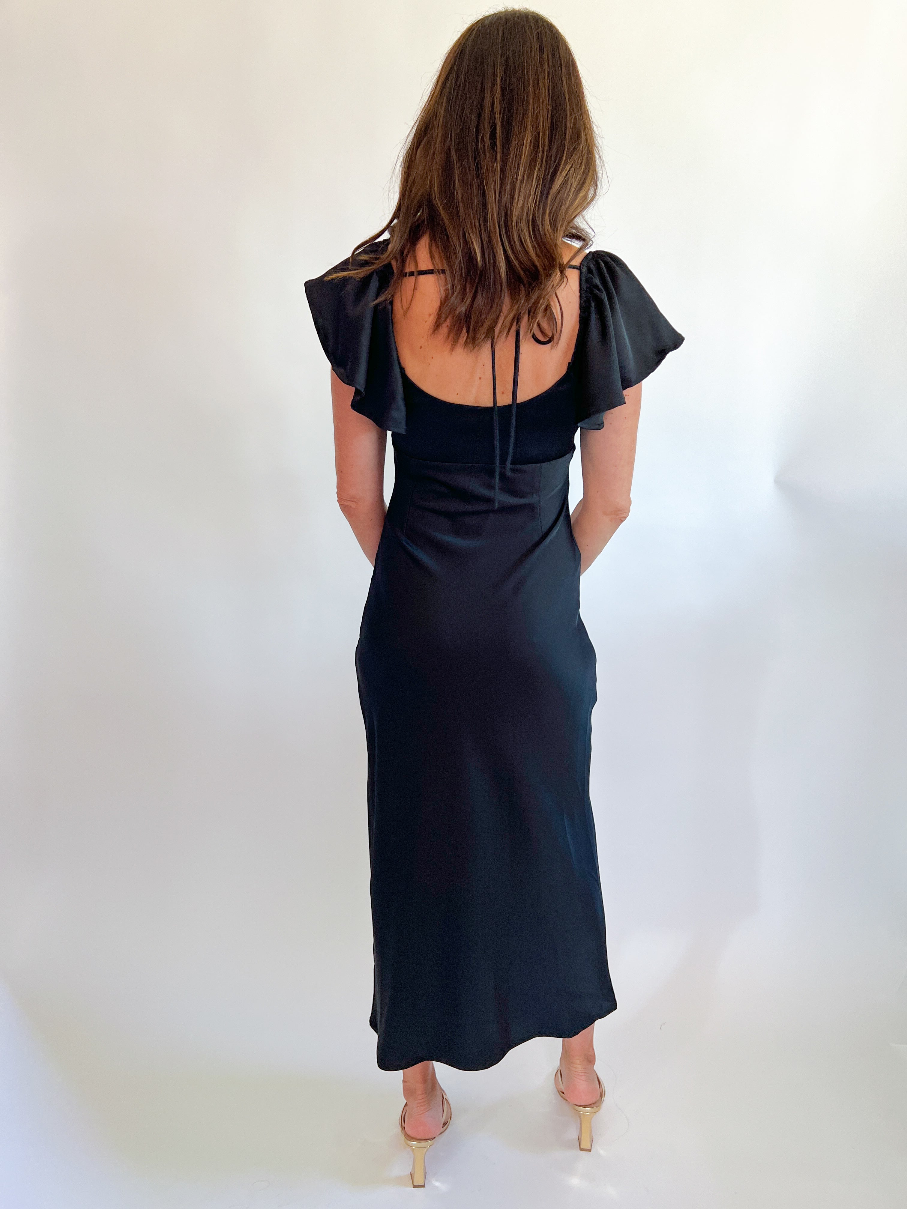 The Blake Tie Back Midi Dress features a charming sweetheart neckline and playful ruffled short sleeves that add a flirty touch. Its chest cut-out detail and open back with a delicate tie closure create an alluring silhouette. Crafted from smooth satin, this midi-length dress offers a perfect blend of elegance and fun for any special occasion.