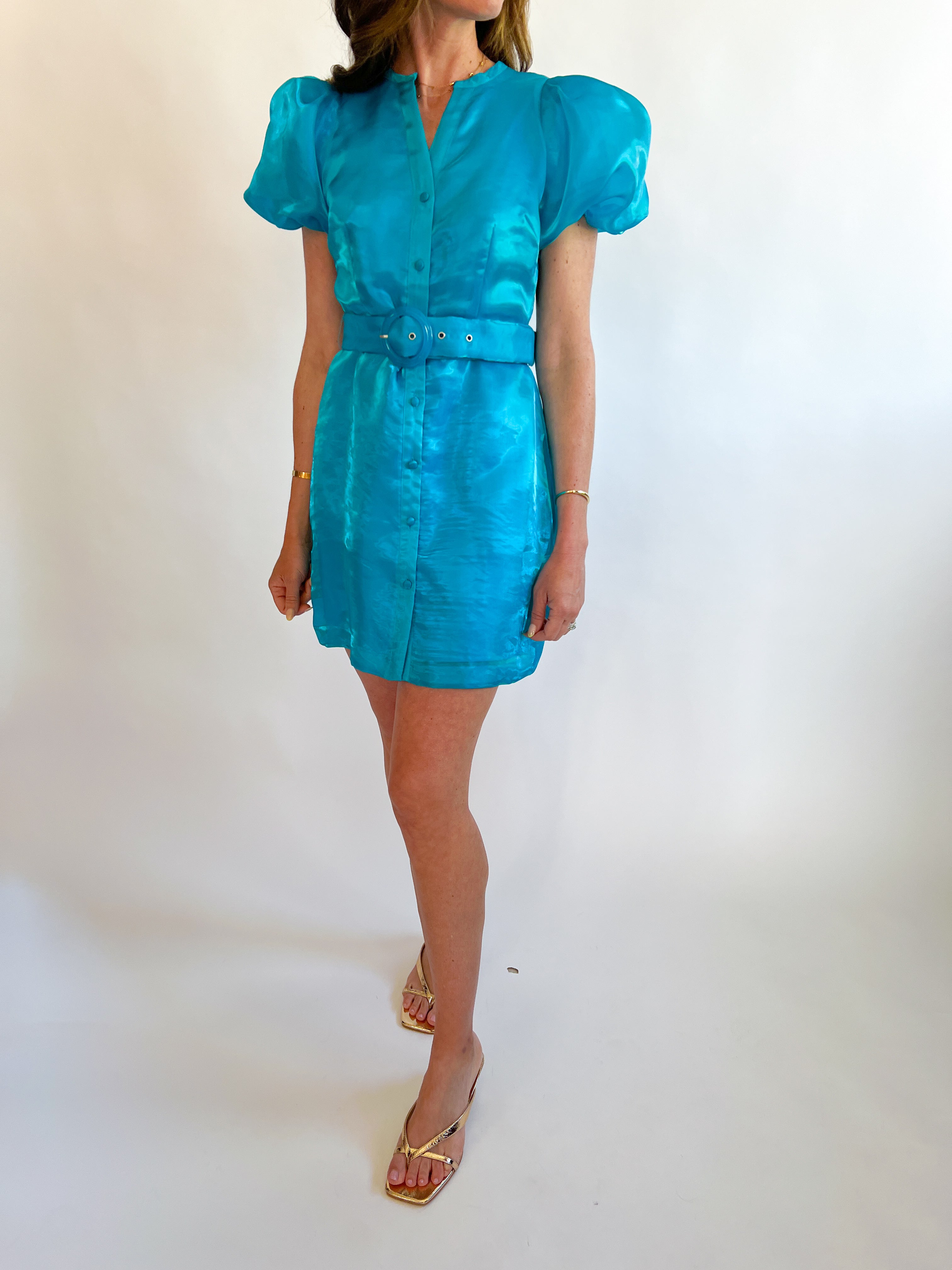 Our Blakely Dress is exactly what your wardrobe is missing! In our new Ultramarine colorway, The Blakely offers a cinched waist with a matching belt, button front and puff sleeves.