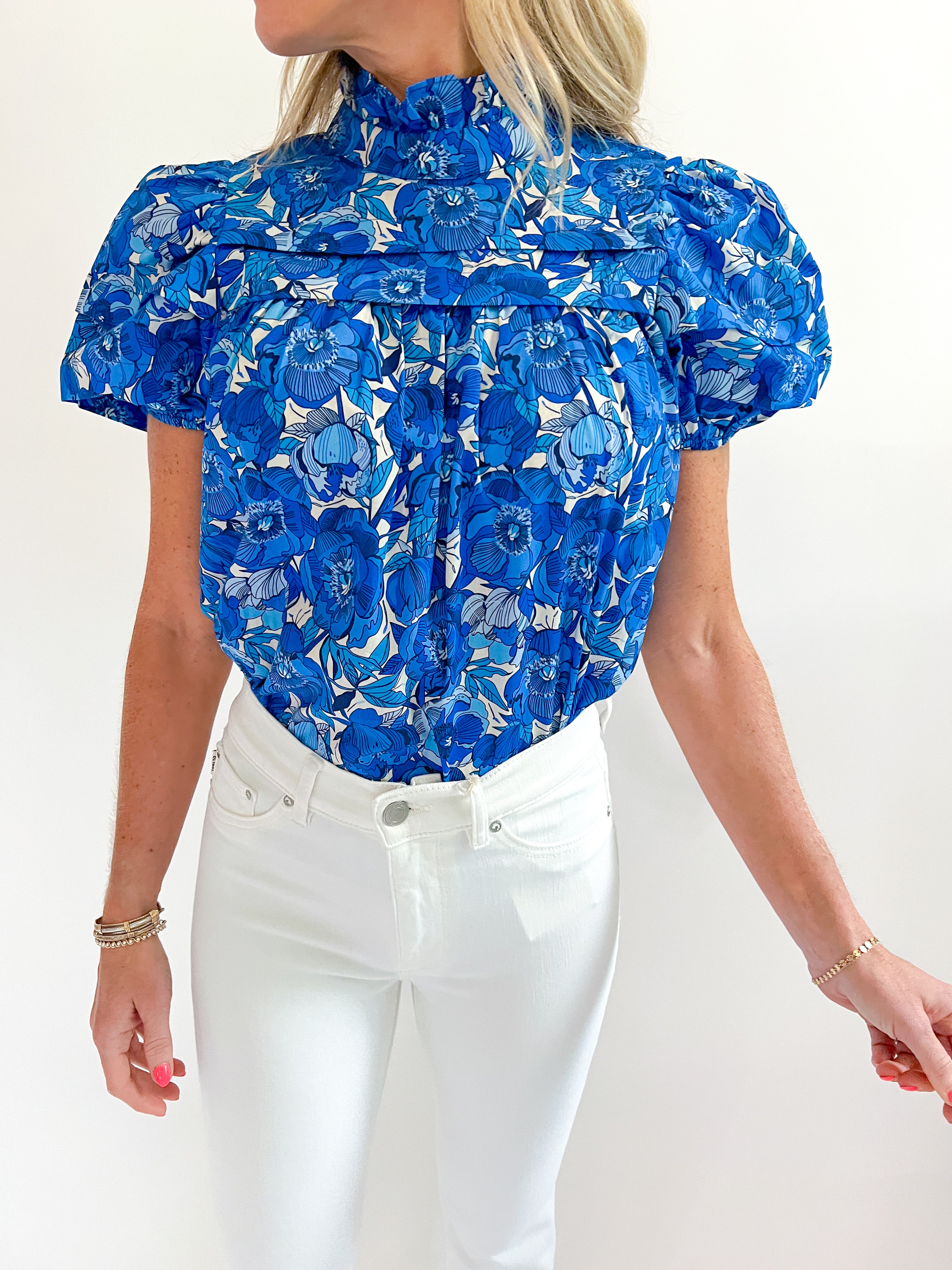 Say hello to the Brody Peony Top! Featuring a ruffled high round neckline, elasticated short sleeves, and gorgeous blue peony pattern. The back keyhole with three-button closure adds charm, while the non-sheer fabric keeps you comfortable. Perfect for adding a touch of floral fun to any outfit!