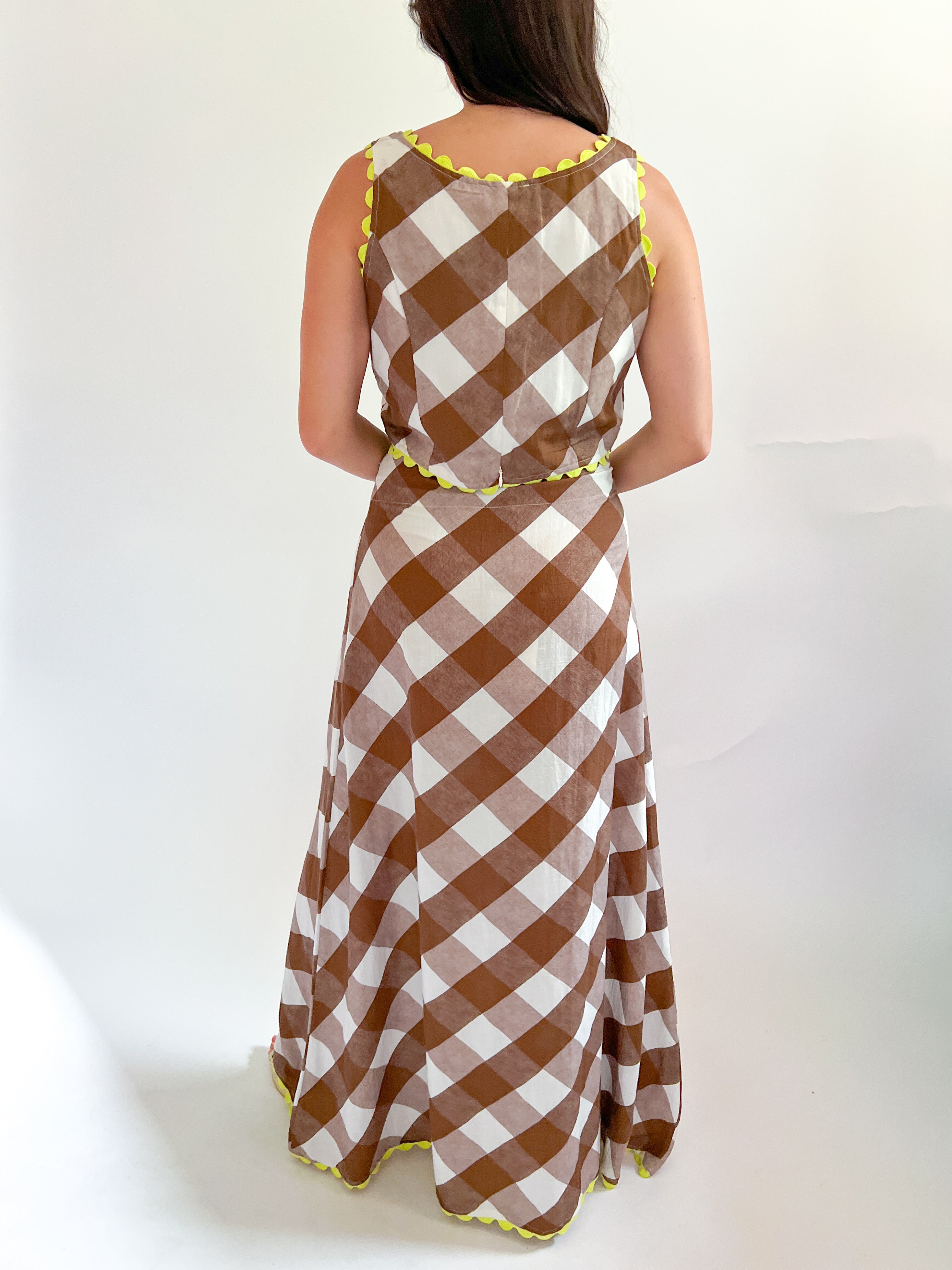 Channel your inner fashionista with the Anita Skirt. Featuring a high waist for a flattering fit, a striking maxi length, and a delicate scalloped trim, this skirt will elevate your style. The brown gingham design adds a touch of playfulness. Complete the look with the matching top for an effortlessly chic ensemble.