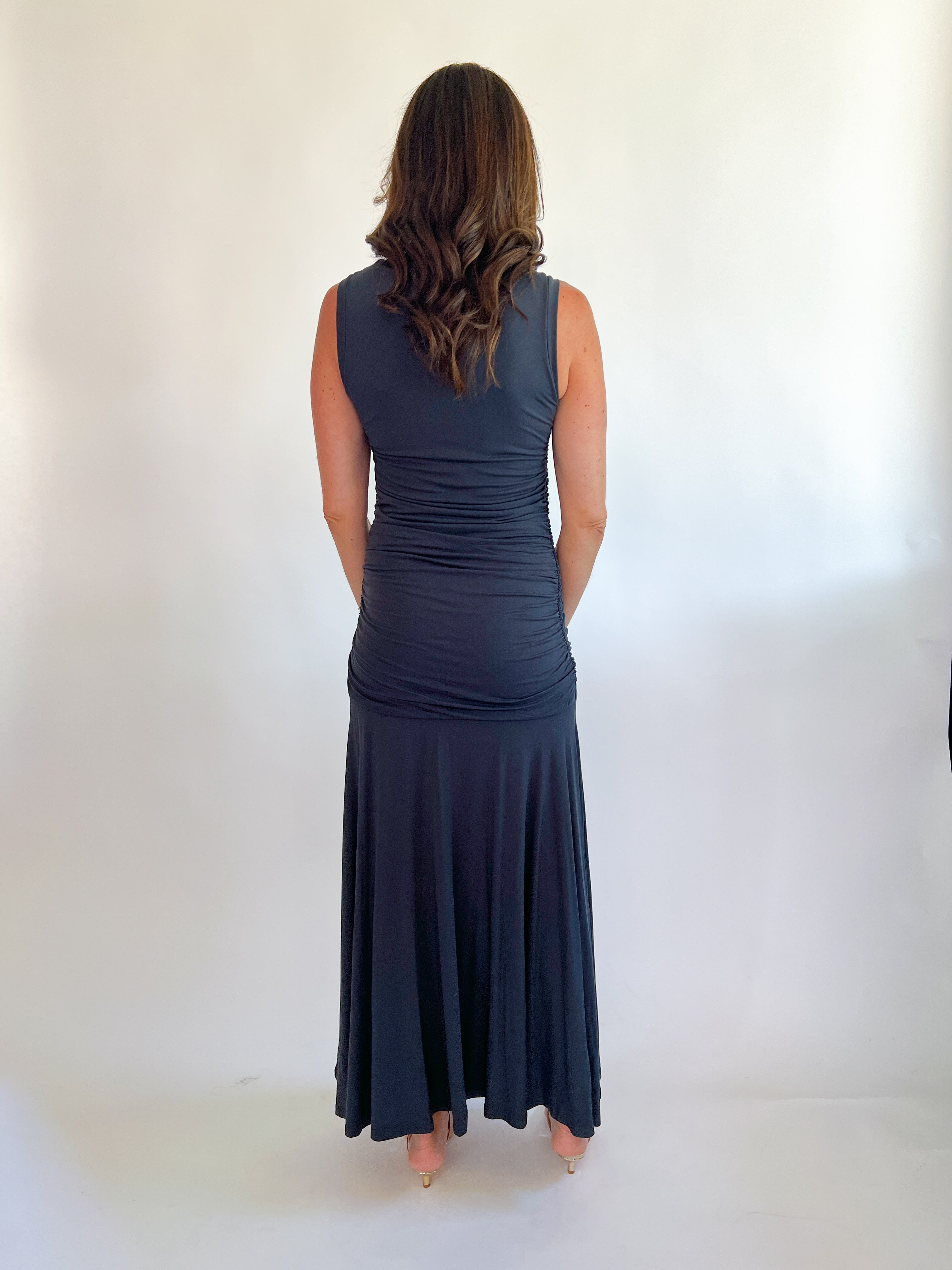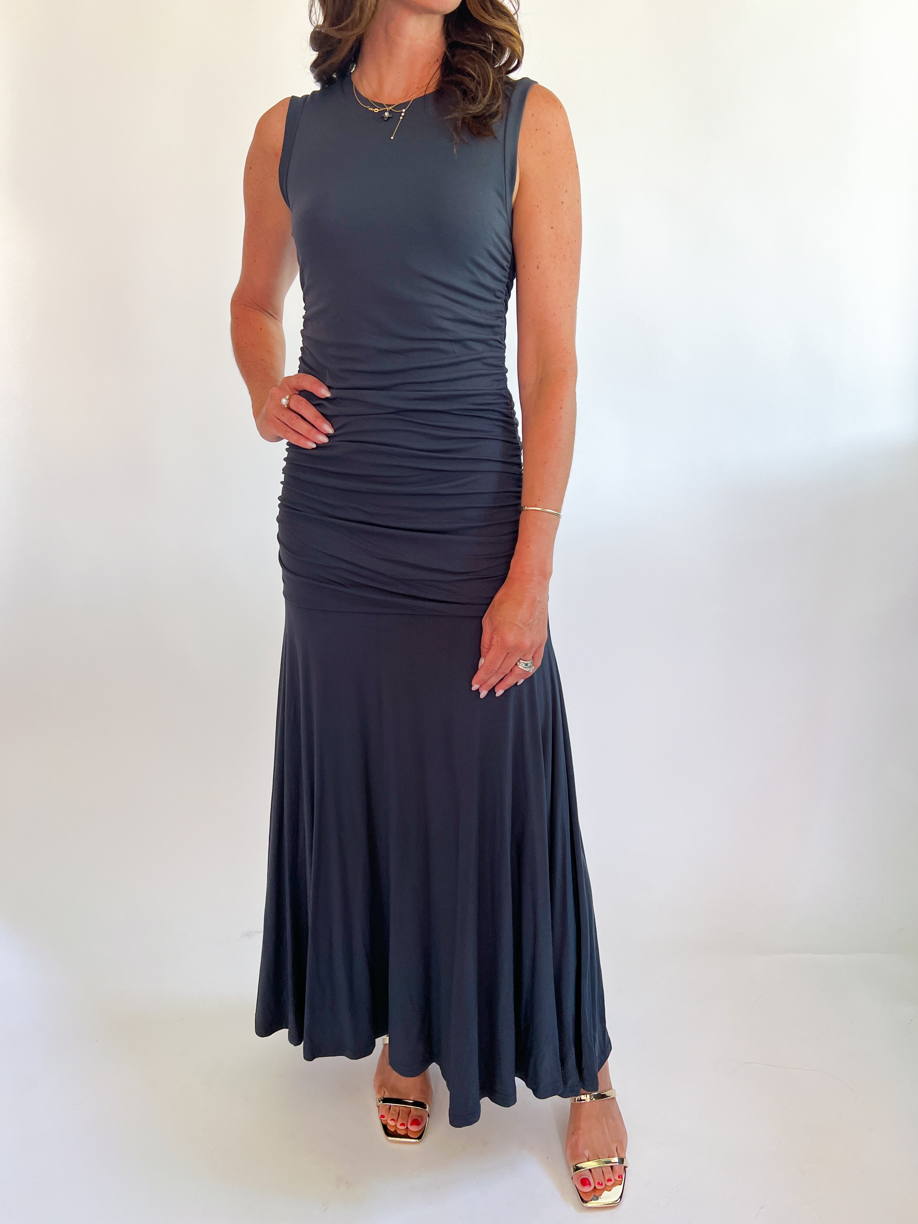 The Jace Maxi Dress is a stunning sleeveless design that hugs your silhouette with a flattering fitted shape. Featuring elegant ruching and a stylish drop waist, it adds a touch of sophistication and movement to your look. Perfect for making a memorable entrance at any event!