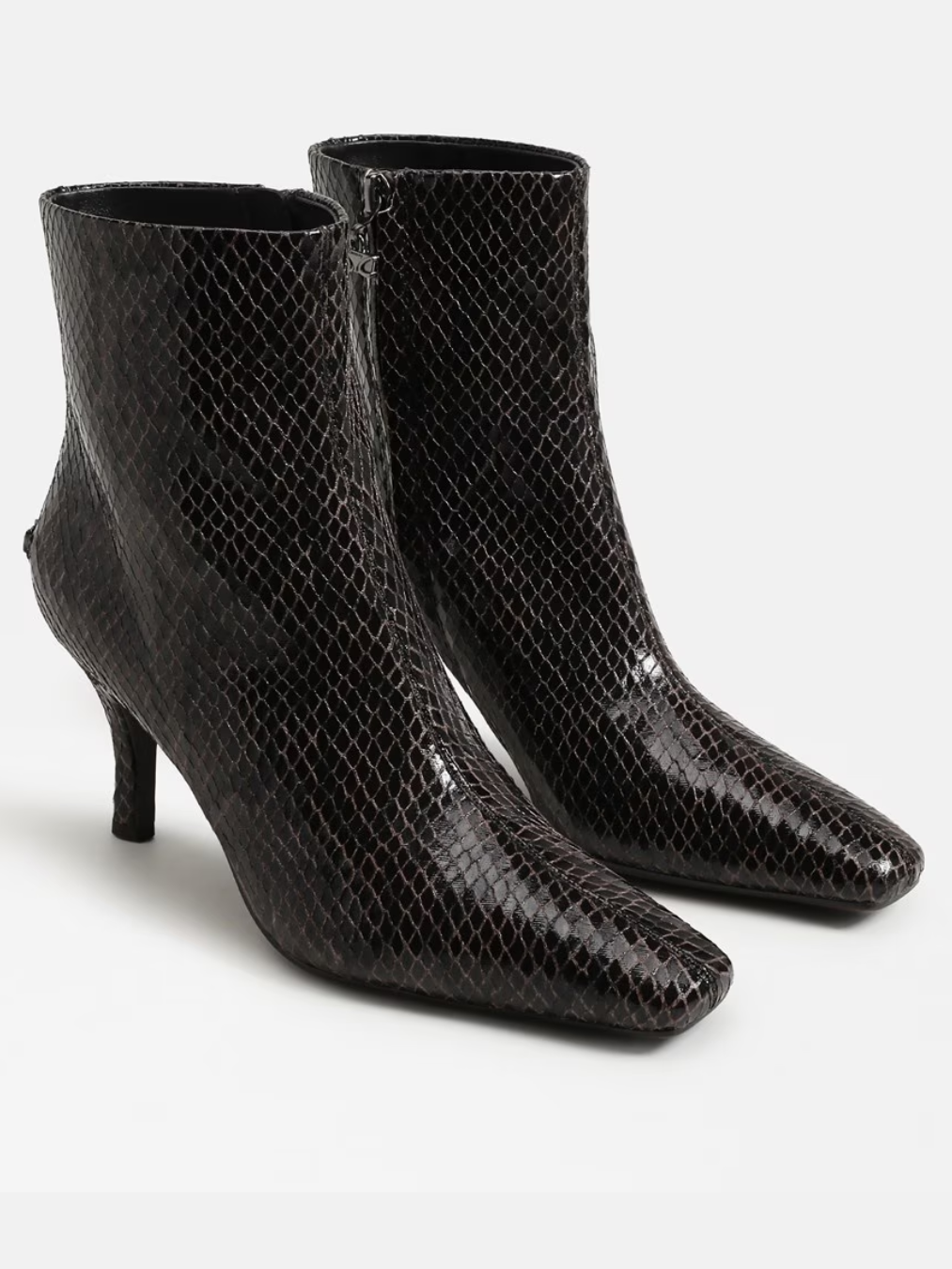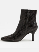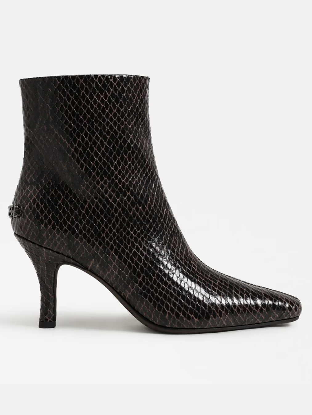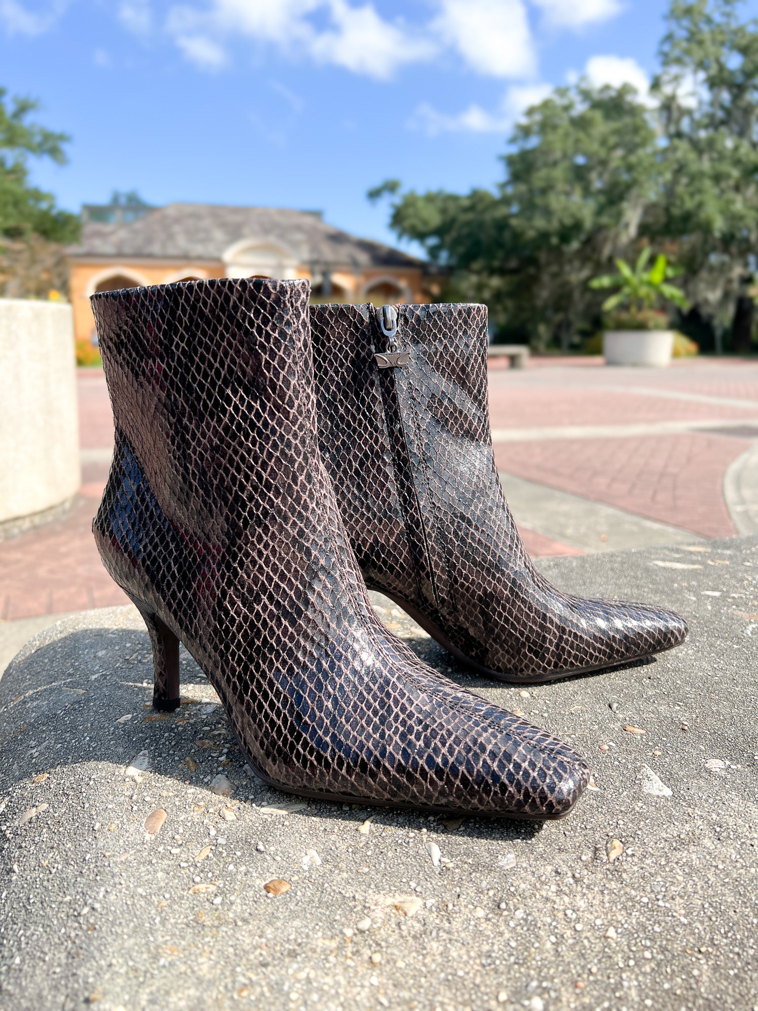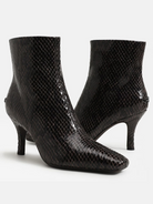 Step up your style with the Laura Snake Ankle Boot, featuring a soft suede finish and a sleek pointed toe for a polished look. The slim 2.75-inch kitten heel adds just the right amount of lift, making it perfect for day-to-night wear. With a convenient zipper closure, these boots bring effortless sophistication and a touch of chic to any outfit.