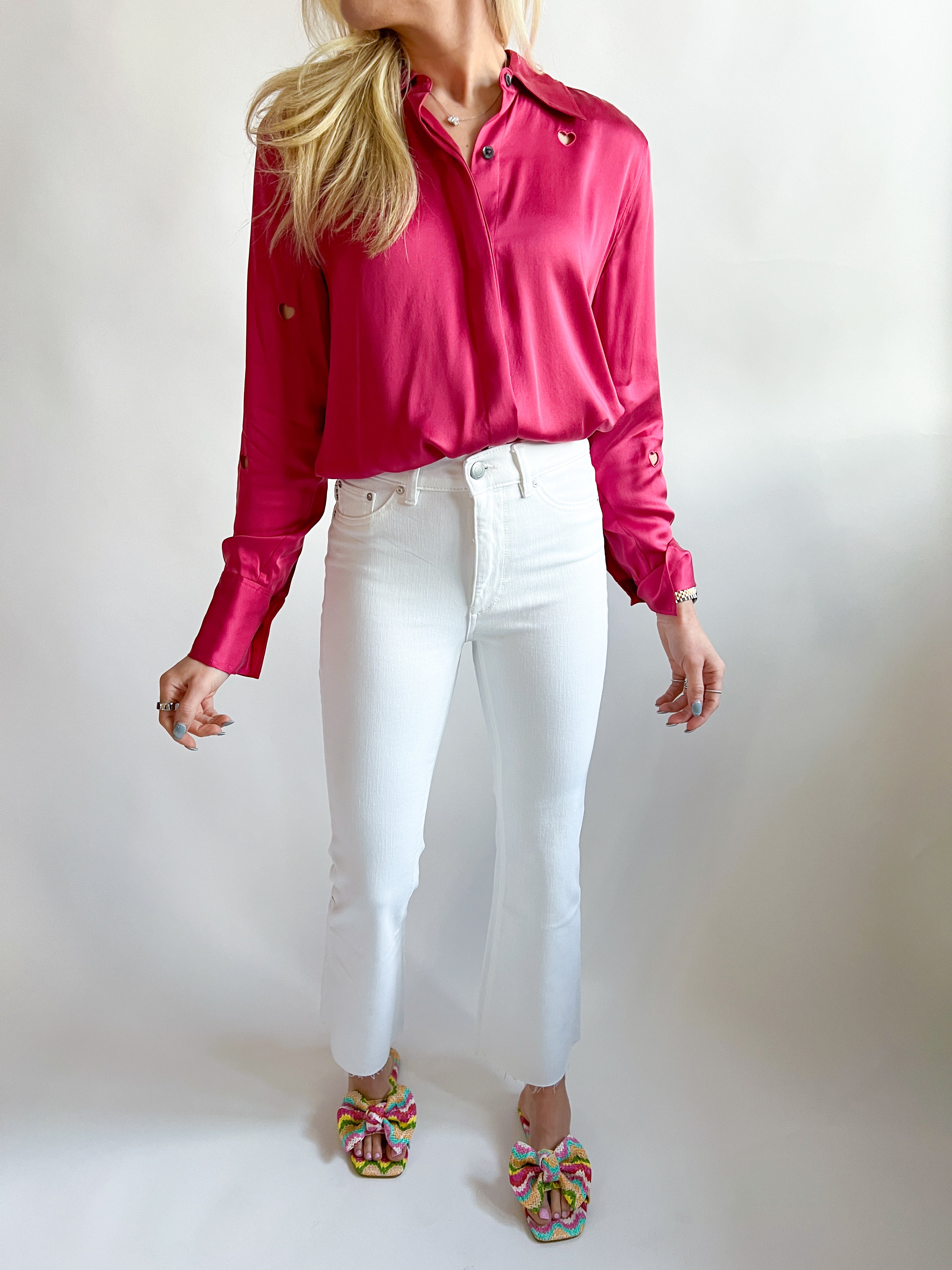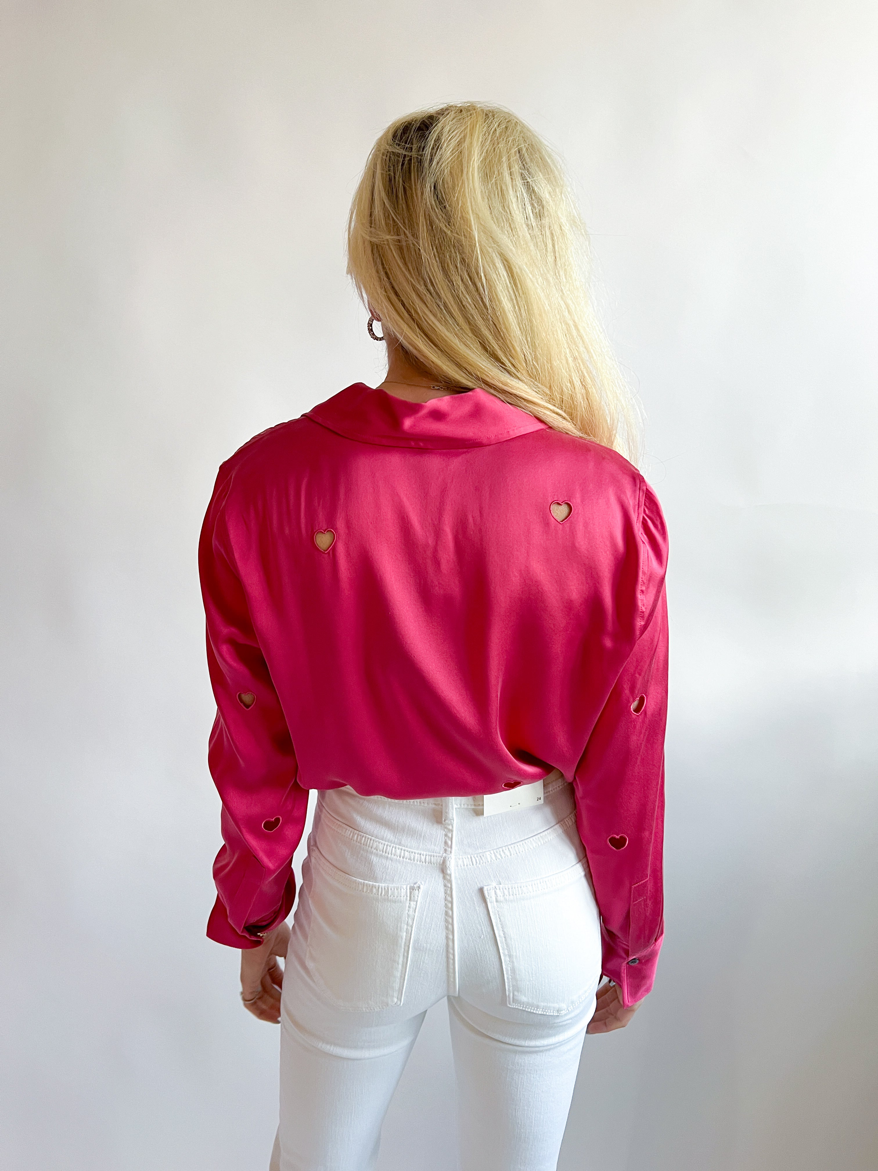 Elevate your wardrobe with the Jacey Valentine Blouse. With a lightweight button-sleeve design, heart cut-outs, and silk charmeuse fabric, this blouse brings an elegant touch to any outfit. From work to the weekend, effortlessly style with jeans or a high-waisted skirt for a chic look.