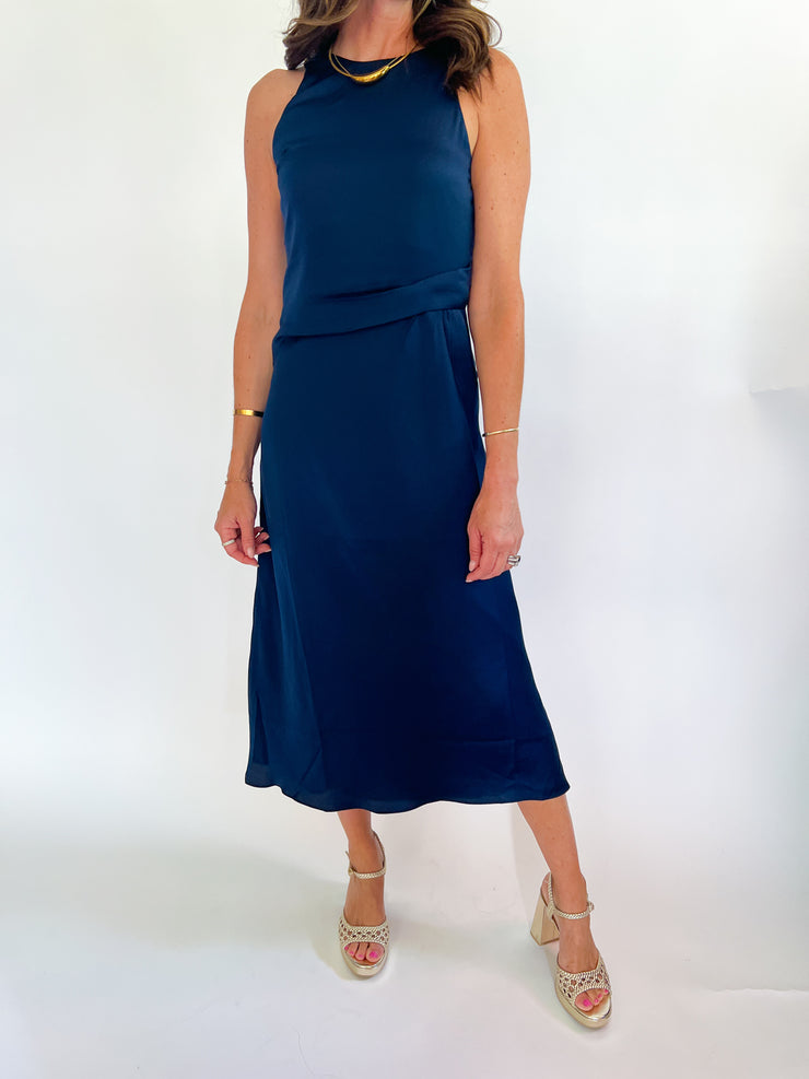 Crafted from a smooth, flowing satin-like fabrication, this dress features a rich, solid navy blue hue that exudes timeless charm. The design showcases a classic round neckline and a sleeveless silhouette, offering a clean and polished look.