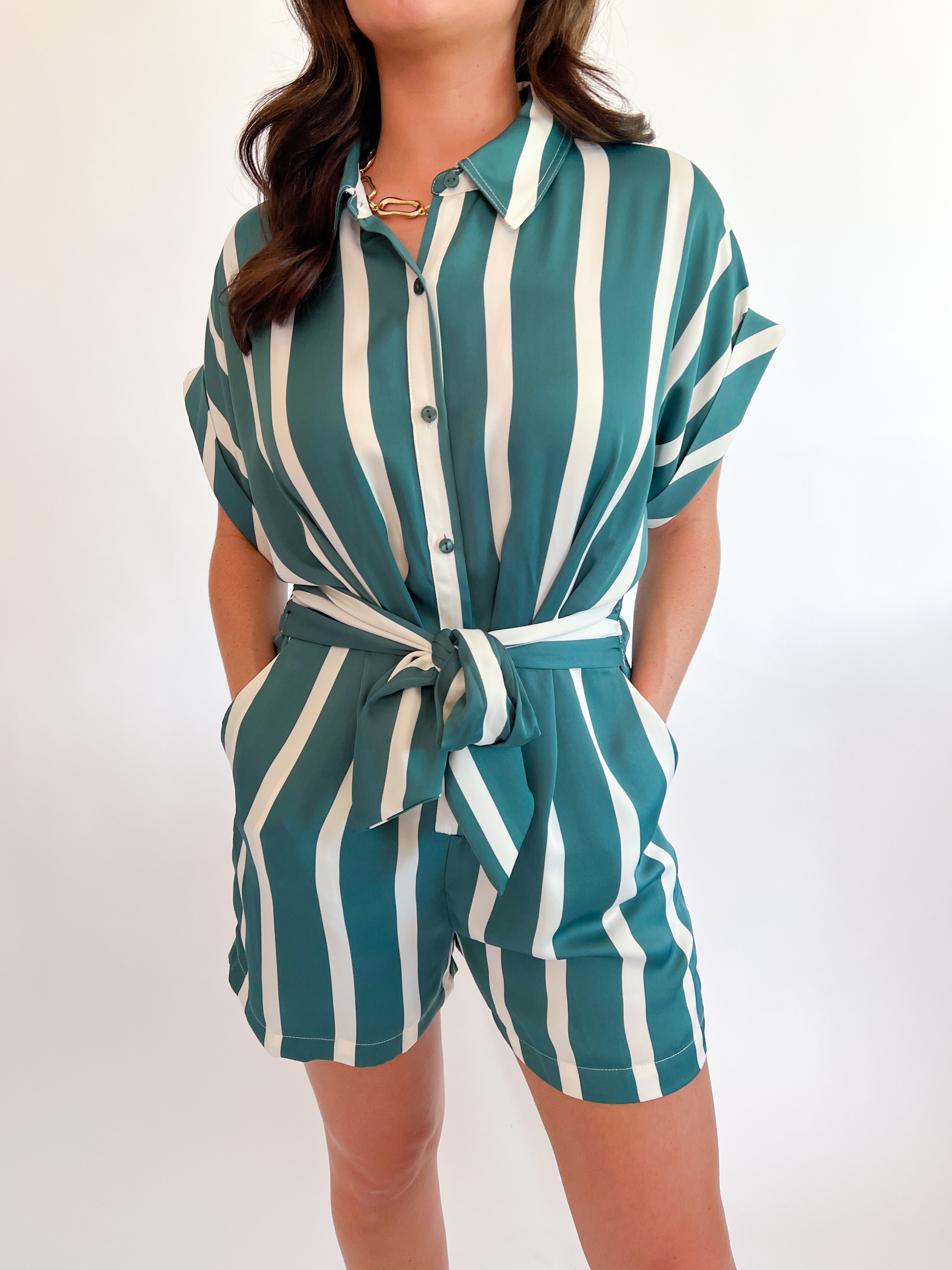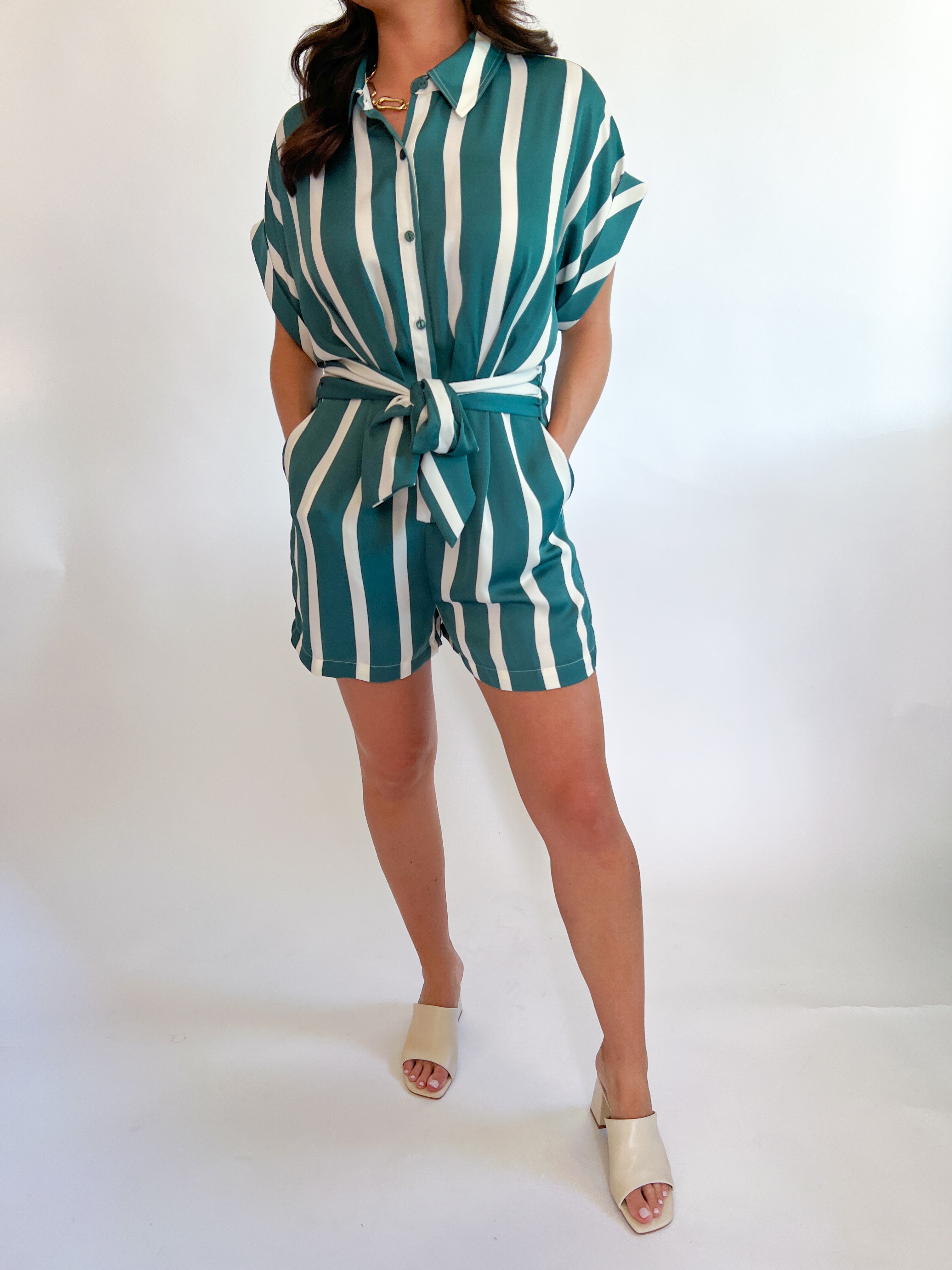 The Tori Romper features a classic collar, cuffed short sleeves, and a button-front closure for a polished look. With a belted waist and handy side pockets, its striped design adds a fresh, stylish vibe perfect for any casual outing.