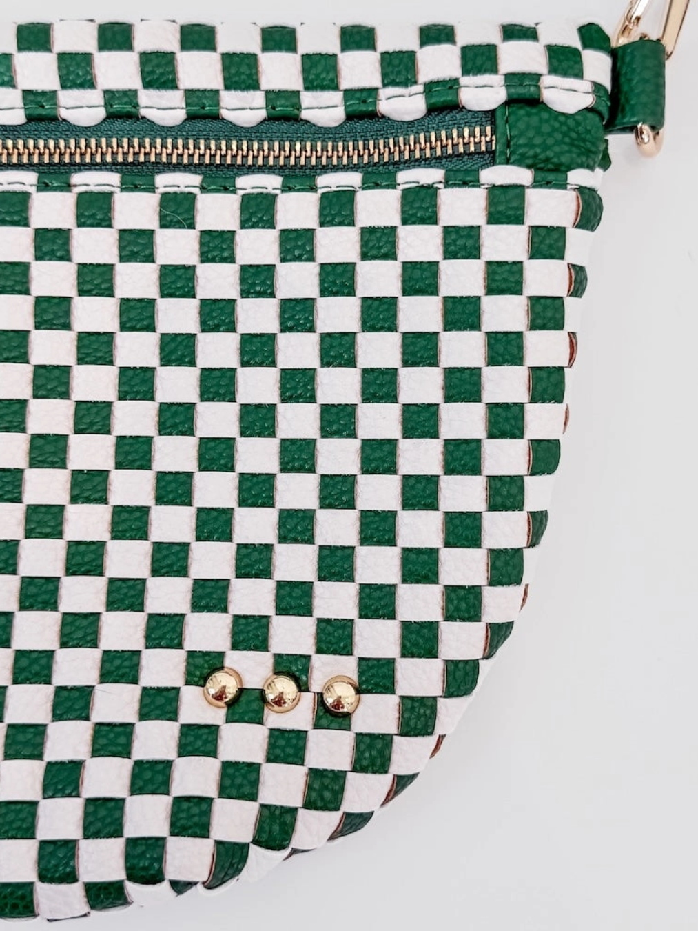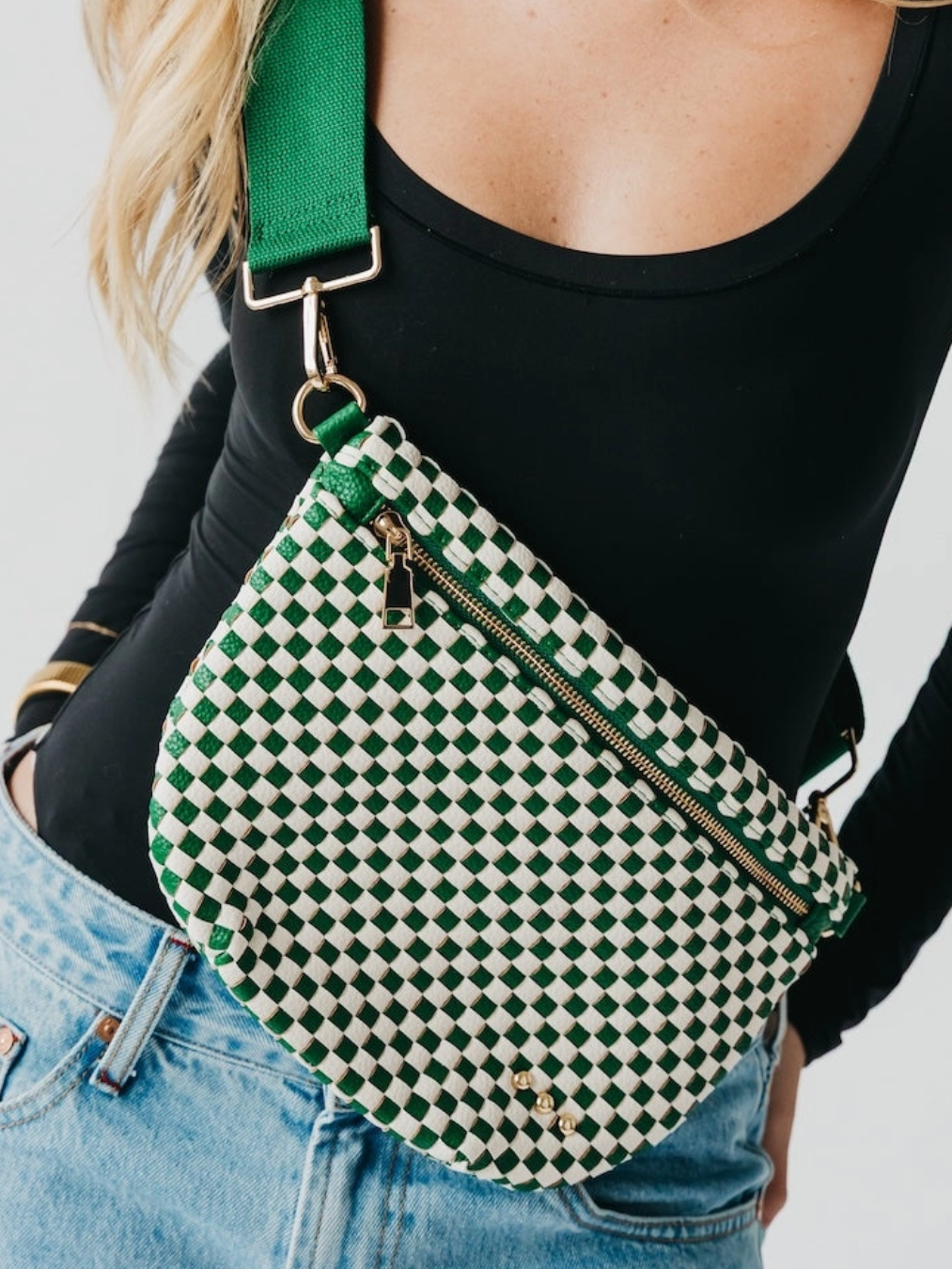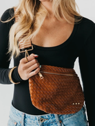 Introducing the Westlyn Woven Bum Bag—your new go-to accessory for effortless style! Crafted from gorgeous vegan leather with intricate woven detailing, this crossbody bag delivers serious rocker-chic energy. Choose from solid colors, bold checkered prints, or eye-catching metallics, each featuring an edgy block design on the strap. Inside, you'll discover a chic beige and black chevron lining plus a convenient zippered slash pocket to keep essentials organized. Premium hardware and smooth zipper closure complete the look. Whether you're dressing up or keeping it casual, this versatile bum bag is the perfect finishing touch to elevate any outfit!